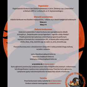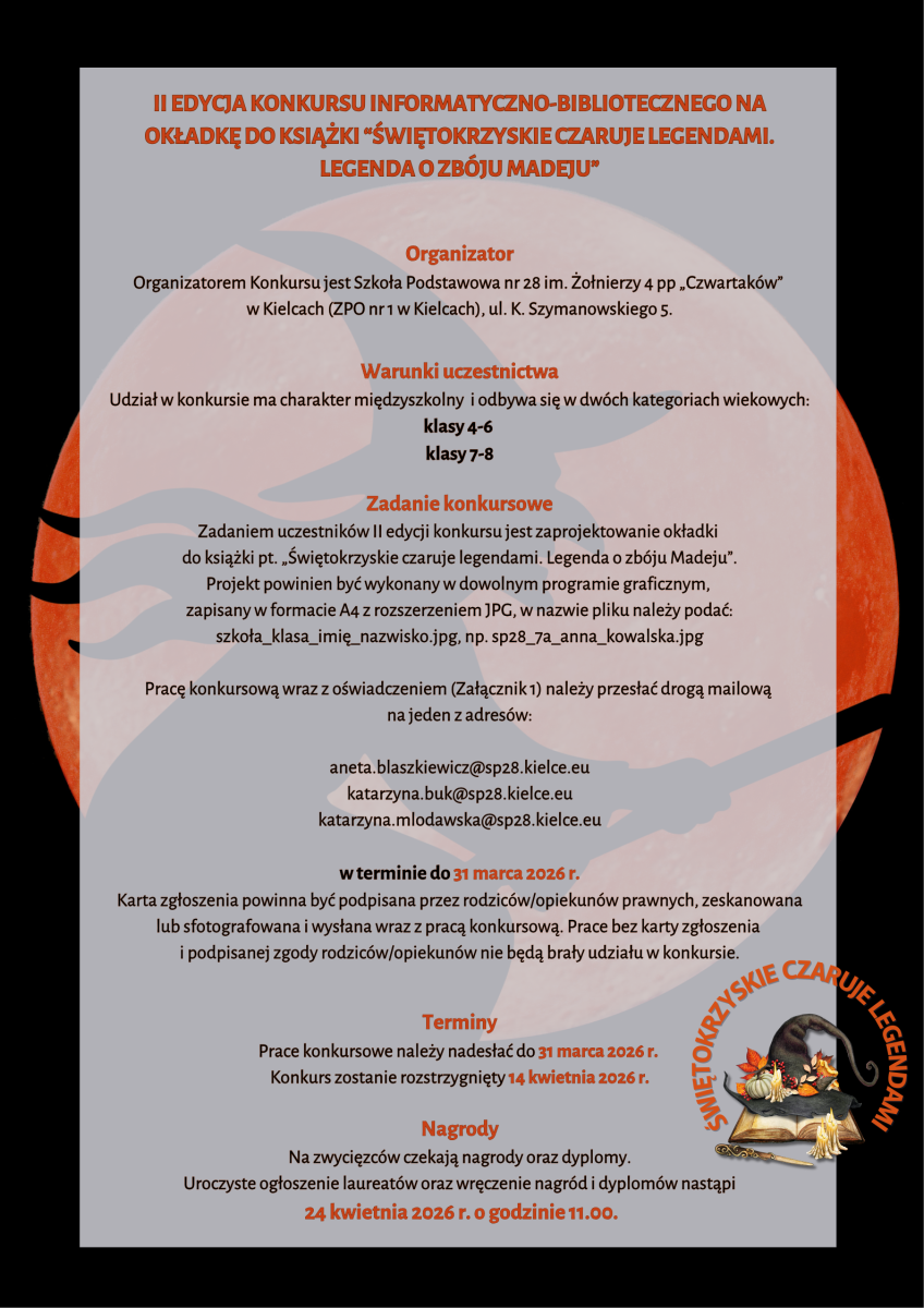 Konkurs zostanie rozstrzygnięty 14 kwietnia 2026 r., wyniki zostaną zamieszczone na stronie internetowej Organizatora www.sp28.kielce.eu oraz wysłane drogą mailową na adres szkół biorących udział w konkursie.