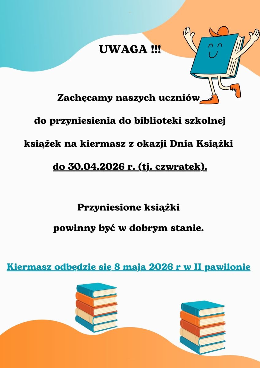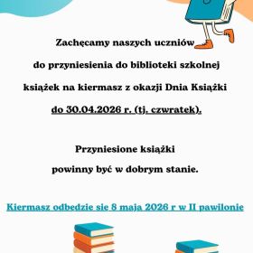 Opublikowano: 23.04.2026 Zachęcamy naszych uczniów do przyniesienia książek do biblioteki szkolnej do 30.04.2026 r. (tj. czwartek) na kiermasz z okazji Dnia Książki, który odbędzie się 8 maja 2026 r. w naszej szkole w pawilonie II.