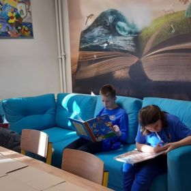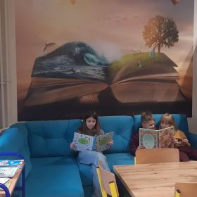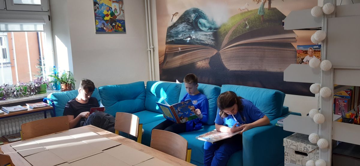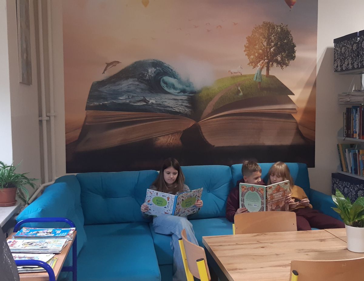 W ten sposób chętnie odpoczywali i spędzali miło czas. Ponadto na korytarzu szkolnym została wyeksponowana gazetka szkolna prezentująca ciekawostki o biblioterapii.