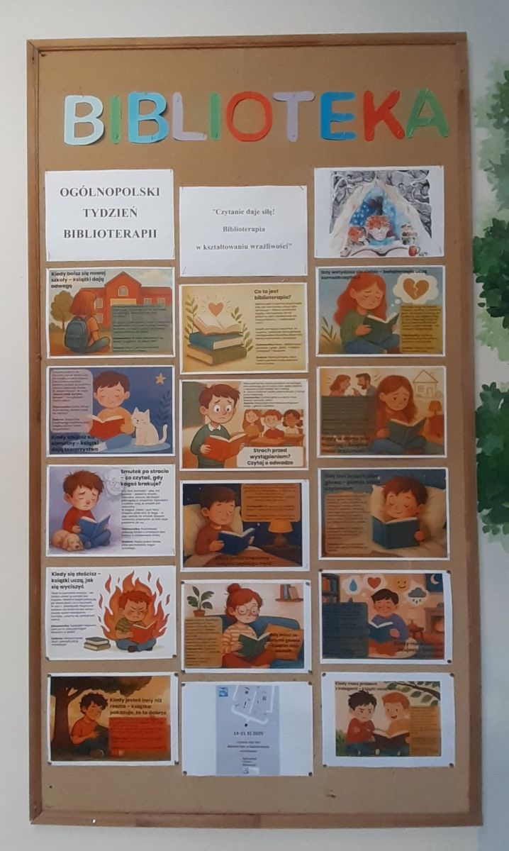Biblioterapia to pomoc przez książki. Słowo „biblioterapia” pochodzi z greki: „biblio” książka, „therapeia” leczenie. Biblioterapia jest rodzajem pomocy gdy coś nas martwi, wywołuje u nas smutek, złość. W takiej sytuacji warto przeczytać książkę, która pokaże nam jak rozwiązać nasze problemy na przykładzie bohaterów, którzy radzą nam jak sobie z nimi poradzić. Książki pozwalają nam zrozumieć nasze emocje i o nich rozmawiać.