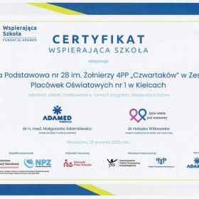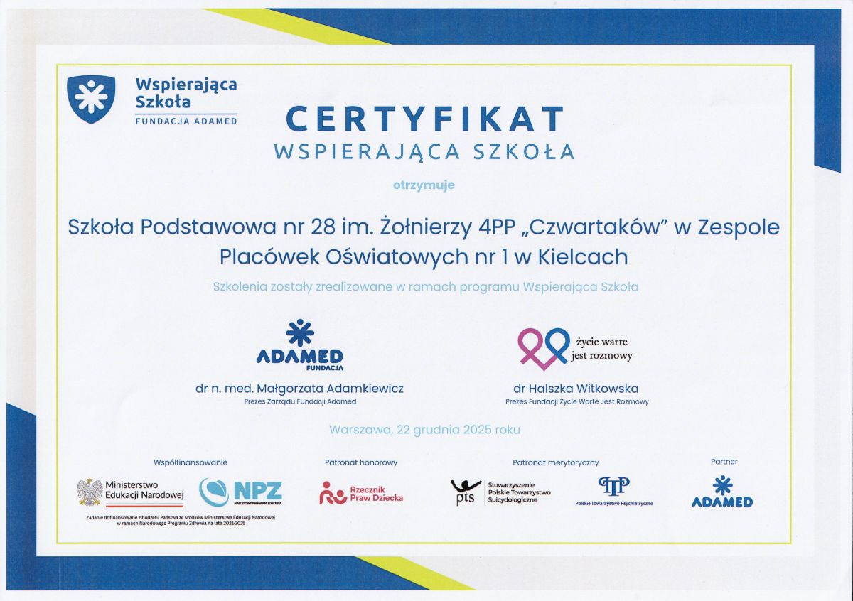 Mamy zaszczyt poinformować, że Szkoła Podstawowa nr 28 im. Żołnierzy 4pp „Czwartaków” uzyskała prestiżowy certyfikat ogólnopolskiego programu „Wspierająca Szkoła”.