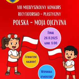 Opublikowano: 24.11.2025 Zapraszamy serdecznie uczniów klas 0-3 do udziału w Międzyszkolnym konkursie recytatorsko- plastycznym "Polska moja Ojczyzna"