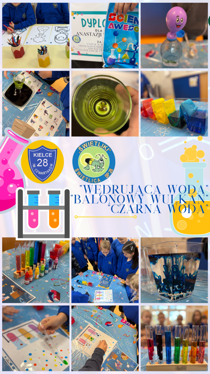 Do tej pory w naszej grupie zrealizowano już dwa eksperymenty: „Lawa Lampa" oraz „Wulkan". Zajęcia odbywają się zazwyczaj raz w tygodniu, w formie warsztatowej i luźnej, z uwzględnieniem dni wolnych i wyjść uczniów. Każdy uczestnik projektu otrzyma dyplom oraz drobny upominek (długopis, brelok i naklejki z motywem chemii i wynalazków).