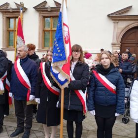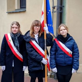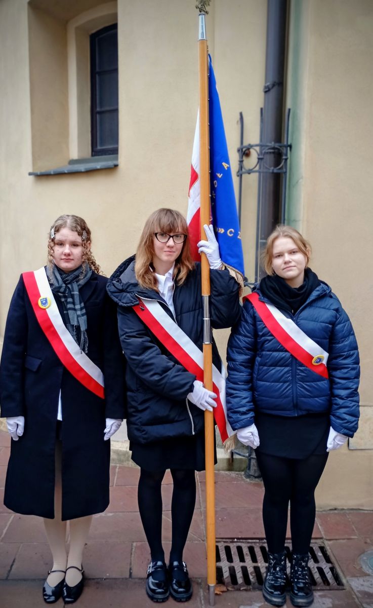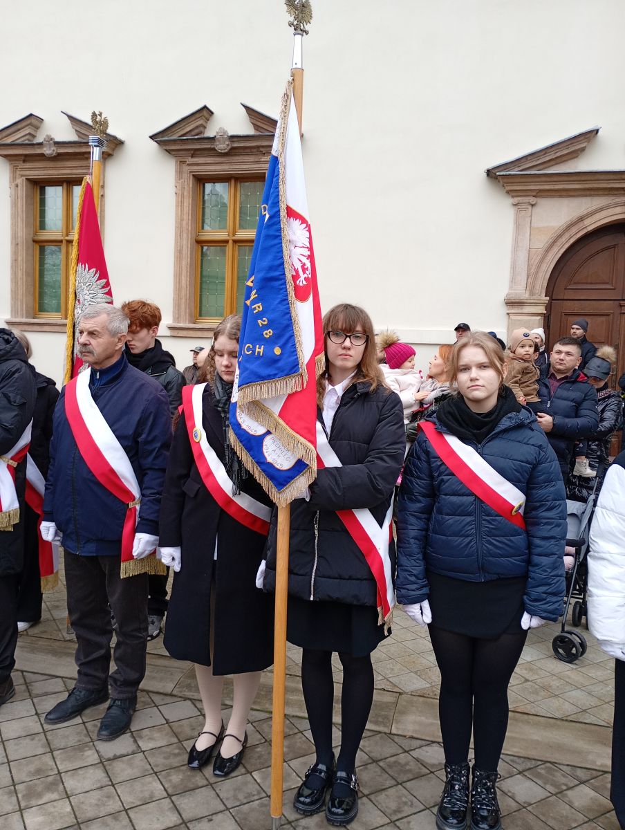 Lena Bednarz, Ada Kaczmarzyk oraz Iga Kałuża z dumą reprezentowały szkołę w obchodach Narodowego Święta Niepodległości. Ich obecność to wyraz szacunku i dumy z polskiej historii wśród młodego pokolenia. W ramach obchodów wzięliśmy udział we Mszy św. w Bazylice Katedralnej, wraz z mieszkańcami Kielc odśpiewaliśmy Hymn Państwowy przed Muzeum Narodowym, następnie dołączyliśmy do Przemarszu przed pomnik Józefa Piłsudskiego. Obecność Pocztu sztandarowego podczas uroczystości podkreśla prestiż szkoły oraz szacunek wobec tradycji narodowych i lokalnych.