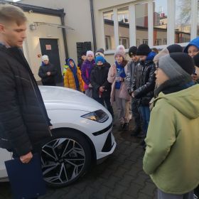 Młodzi przyrodnicy z kl. 5b uczestniczyli w pokazie auta elektrycznego - na szkolnym parkingu zaparkował ekopojazd z Folwarku Samochodowego w Kielcach. Pan Patryk Rycąbel wyjaśnił piątoklasistom, że, co prawda, elektryki wymagają rzadkich surowców takich jak nikiel czy kobalt to jednak nie powodują powstawania miejskiego smogu i emisji gazów cieplarnianych. Rozwój elektromobilności w połączeniu z OZE może przynieść korzyści i ekologiczne i ekonomiczne. Serdecznie dziękujemy Pani Dyrektor Małgorzacie Michalec oraz Panu Dyrektorowi Dominikowi Ciszewskiemu za użyczenie auta do niecodziennej lekcji.