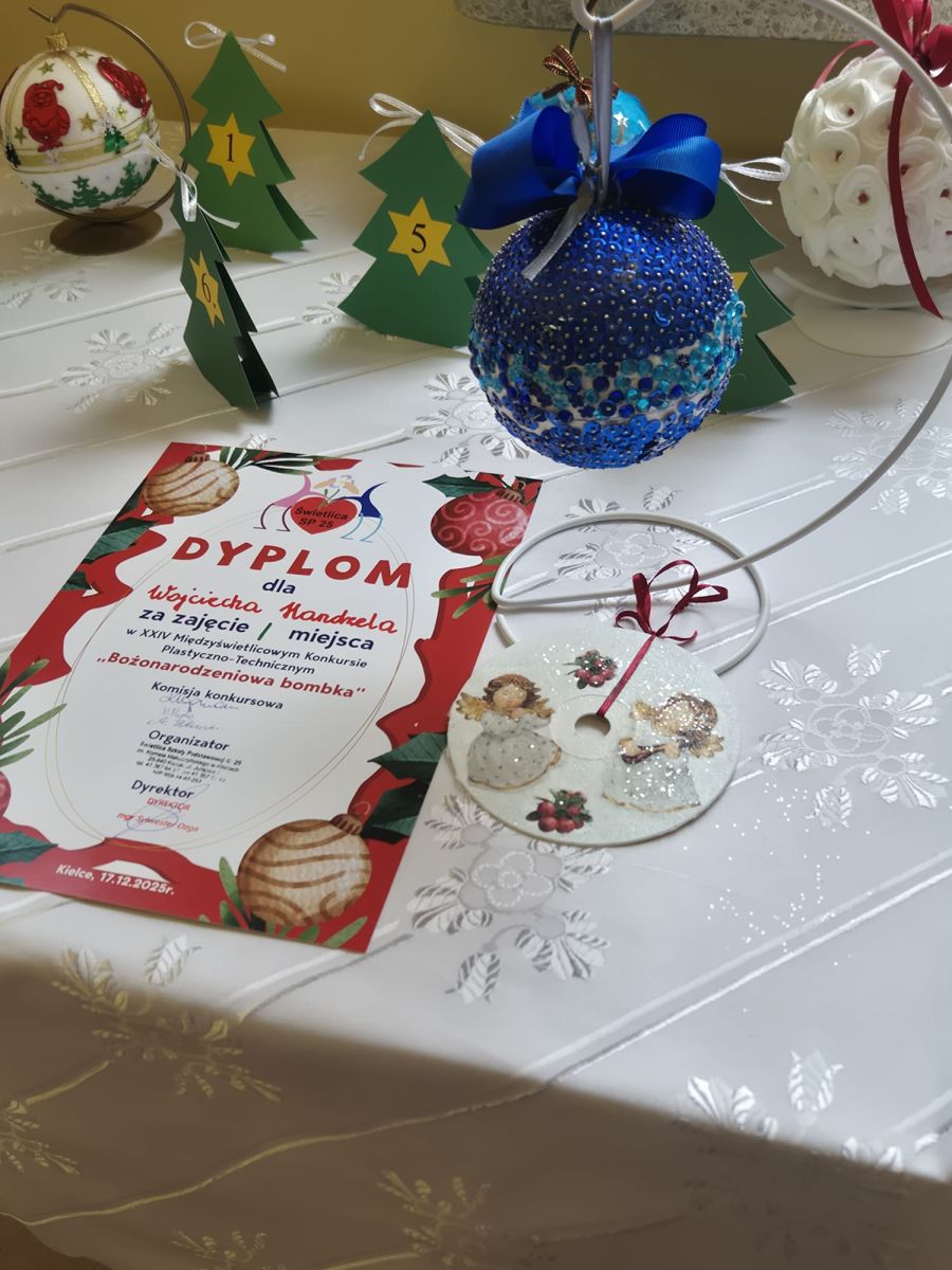 ❄️❄️❄️❄️❄️❄️❄️W konkursie nie zabrakło pięknych i kreatywnych prac, jednak bombka wykonana przez Wojtka zachwyciła jury swoją oryginalnością, starannością oraz świątecznym klimatem. To wspaniały dowód na to, że talent, zaangażowanie i pasja przynoszą piękne efekty. Opiekunem podczas konkursu i osobą wspierająca była Pani Wioletta Kot.