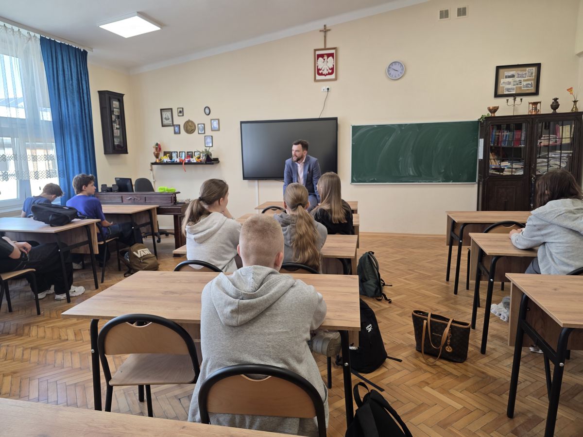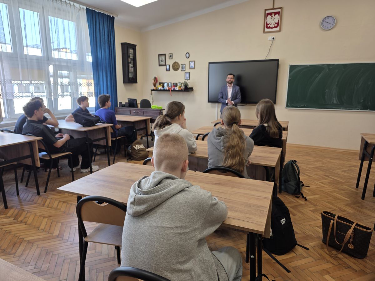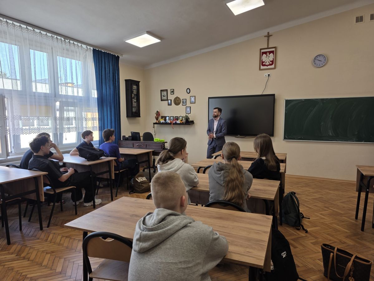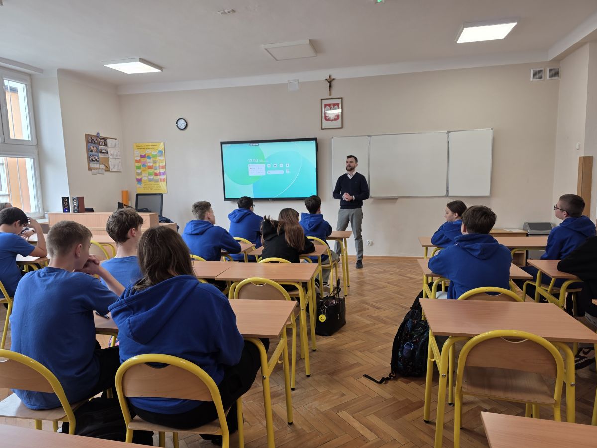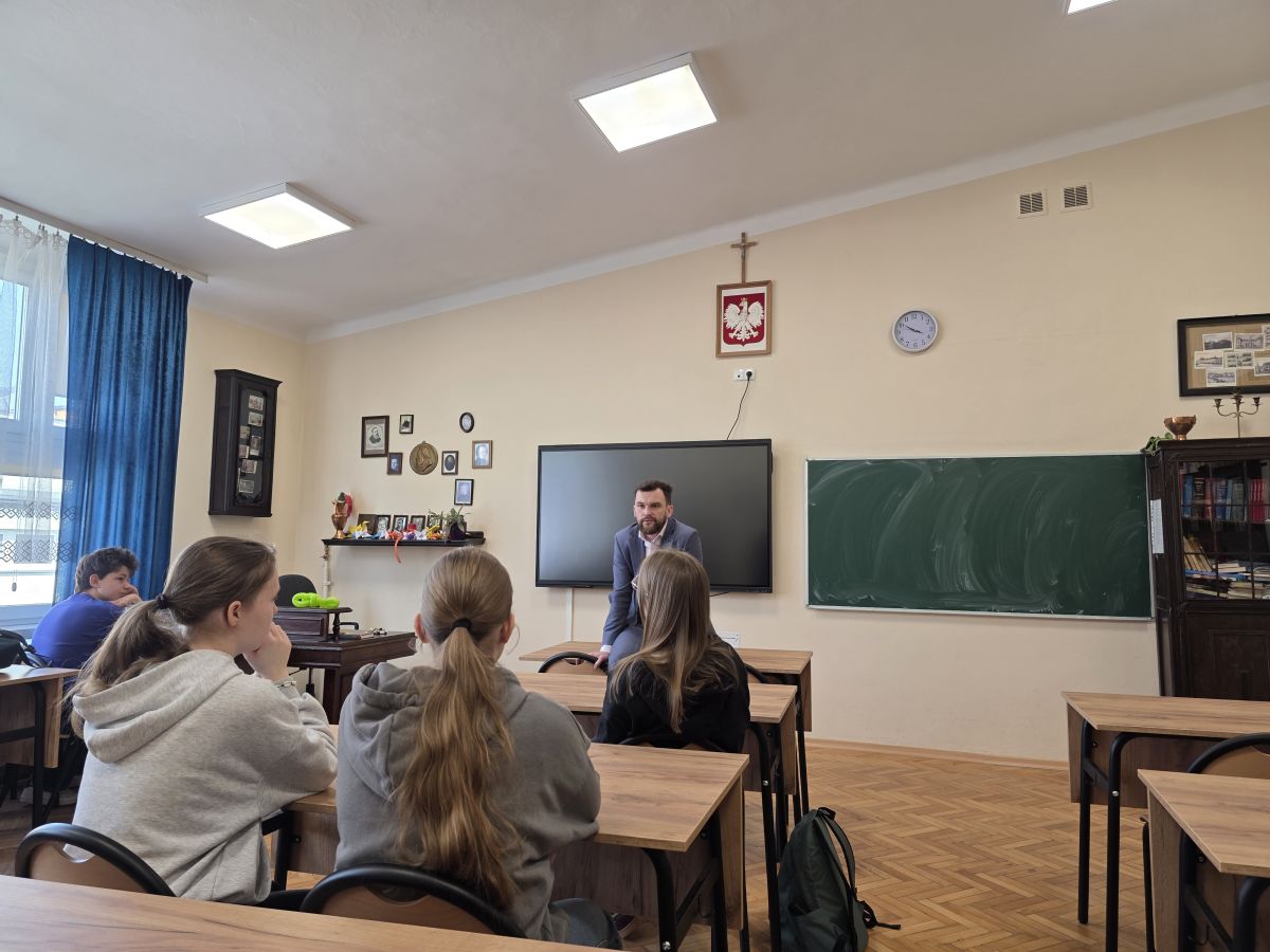 W dniach 14 i 17 kwietnia 2026 r. gościem w naszej szkole był Pan Łukasz Kupis, który na co dzień wykonuje zawód notariusza, a nas odwiedził w ramach ogólnopolskiej akcji Dzień Edukacji Prawnej organizowanej m.in. przez Ministerstwo Sprawiedliwości i Naczelna Radę Adwokacką. Uczestniczący w spotkaniach uczniowie klas 7 mieli możliwość nie tylko poznać różne specjalizacje zawodów prawniczych, ale także uzyskać odpowiedzi na nurtujące ich pytania natury prawnej. Pan Łukasz w fachowy sposób udzielał nam informacji i objaśniał zawiłości prawne, z rozwiązaniem których borykamy się w życiu codziennym. Uświadomiliśmy sobie, że zawody prawnicze mogą być naprawdę pasjonujące, a samo prawo służy nam wszystkim i wszystkich nas dotyczy, dlatego warto pamiętać o jego zasadach i przepisach.
