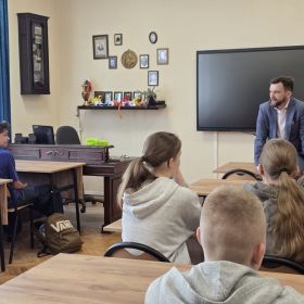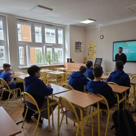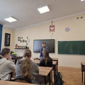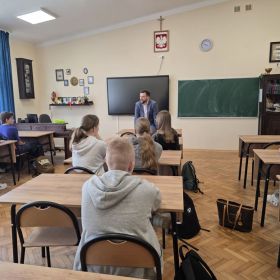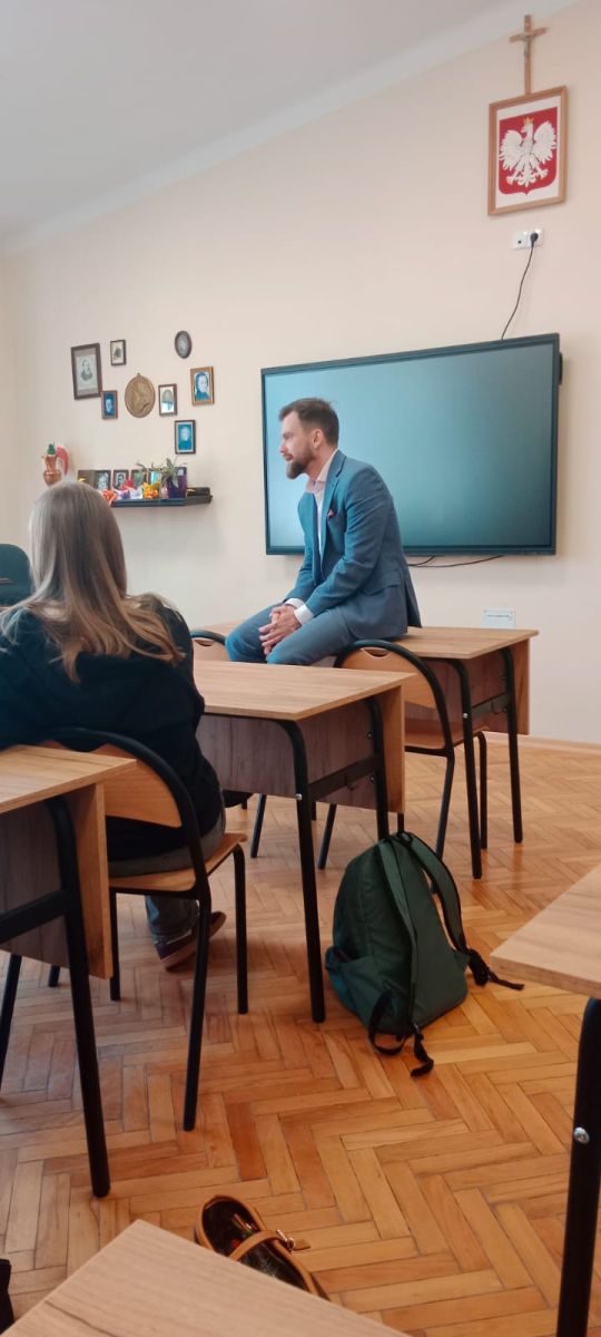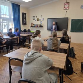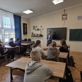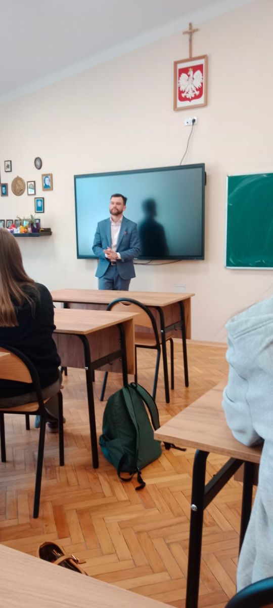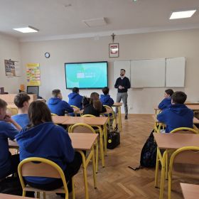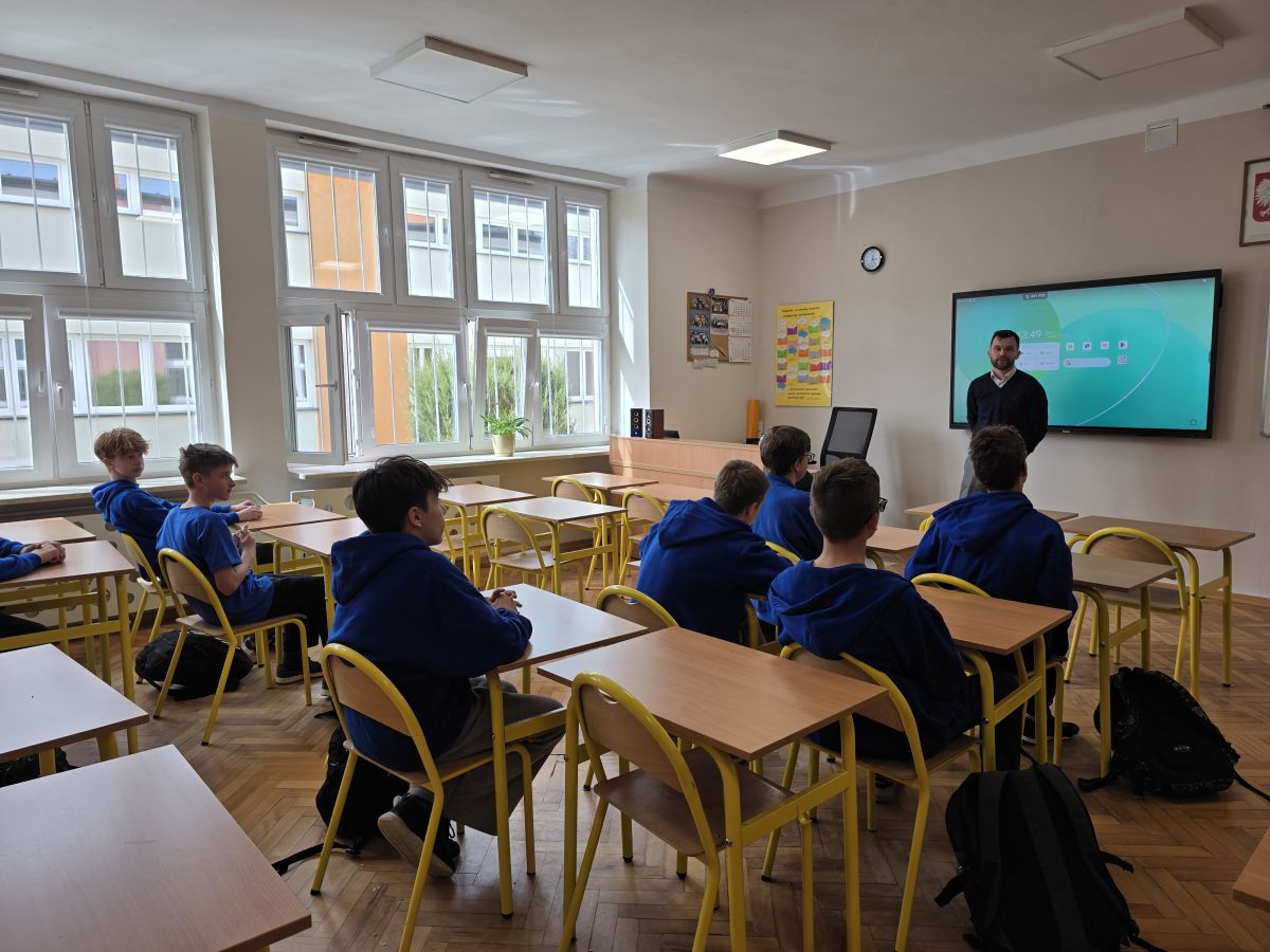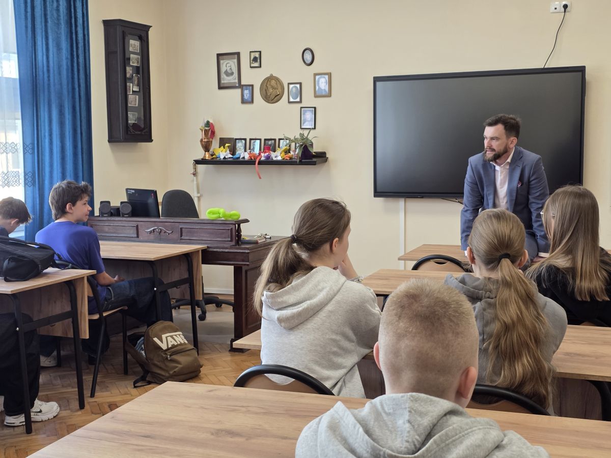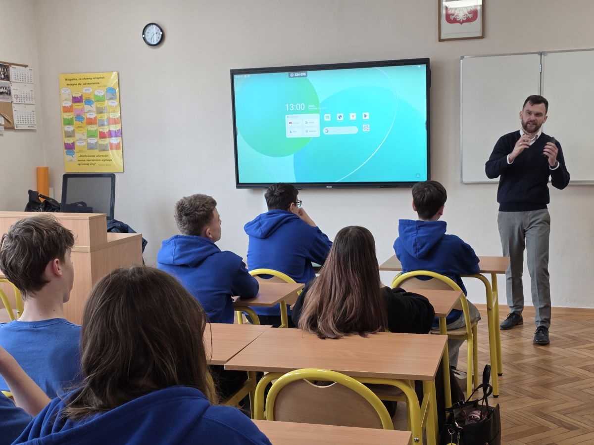 W dniach 14 i 17 kwietnia 2026 r. gościem w naszej szkole był Pan Łukasz Kupis, który na co dzień wykonuje zawód notariusza, a nas odwiedził w ramach ogólnopolskiej akcji Dzień Edukacji Prawnej organizowanej m.in. przez Ministerstwo Sprawiedliwości i Naczelna Radę Adwokacką. Uczestniczący w spotkaniach uczniowie klas 7 mieli możliwość nie tylko poznać różne specjalizacje zawodów prawniczych, ale także uzyskać odpowiedzi na nurtujące ich pytania natury prawnej. Pan Łukasz w fachowy sposób udzielał nam informacji i objaśniał zawiłości prawne, z rozwiązaniem których borykamy się w życiu codziennym. Uświadomiliśmy sobie, że zawody prawnicze mogą być naprawdę pasjonujące, a samo prawo służy nam wszystkim i wszystkich nas dotyczy, dlatego warto pamiętać o jego zasadach i przepisach.