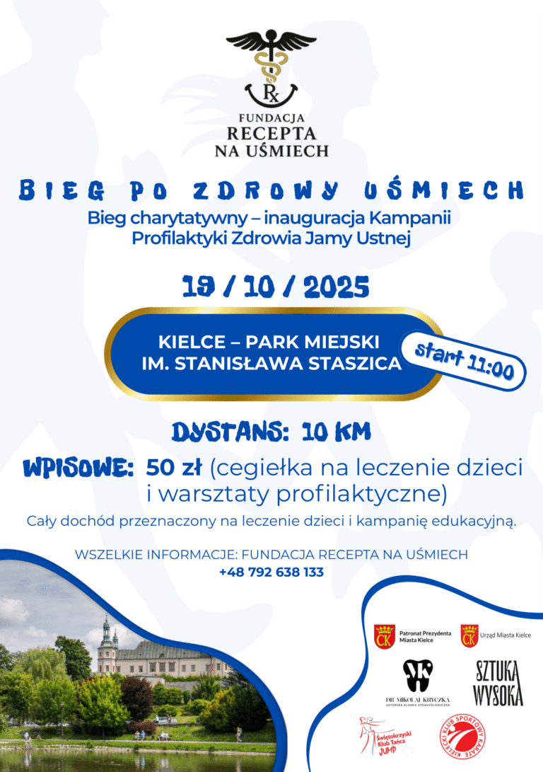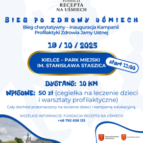Chcąc zainaugurować kampanię w sposób aktywny w niedzielę 19 października 2025 r. o godz. 11:00 w Parku Miejskim im. Stanisława Staszica w Kielcach, organizatorzy zapraszają na Bieg po Zdrowy Uśmiech na dystansie 10 km.