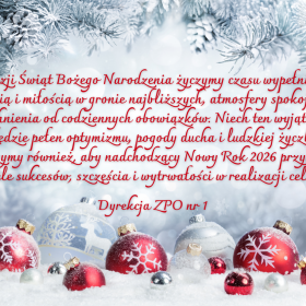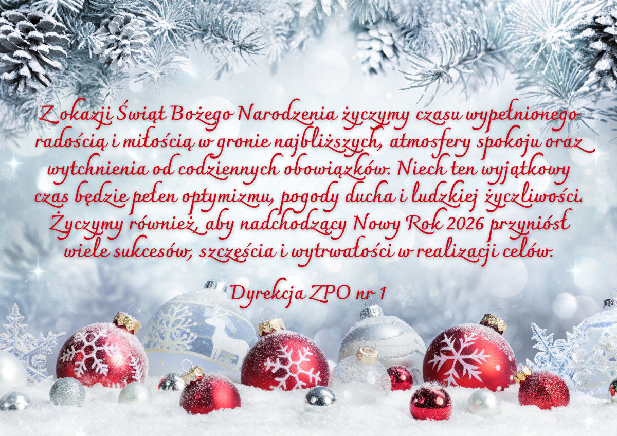 Z okazji Świąt Bożego Narodzenia życzymy czasu wypełnionego radością i miłością w gronie najbliższych, atmosfery spokoju oraz wytchnienia od codziennych obowiązków. Niech ten wyjątkowy czas będzie pełen optymizmu, pogody ducha i ludzkiej życzliwości. Życzymy również, aby nadchodzący Nowy Rok 2026 przyniósł wiele sukcesów, szczęścia i wytrwałości w realizacji celów.