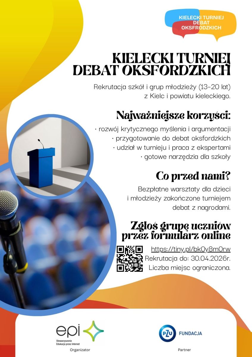 Stowarzyszenie Edukacja przez Internet zaprasza szkoły podstawowe i ponadpodstawowe z terenu Kielc i powiatu kieleckiego do udziału w projekcie "Kielecki Turniej Debat Oksfordzkich".