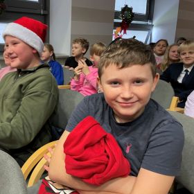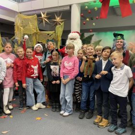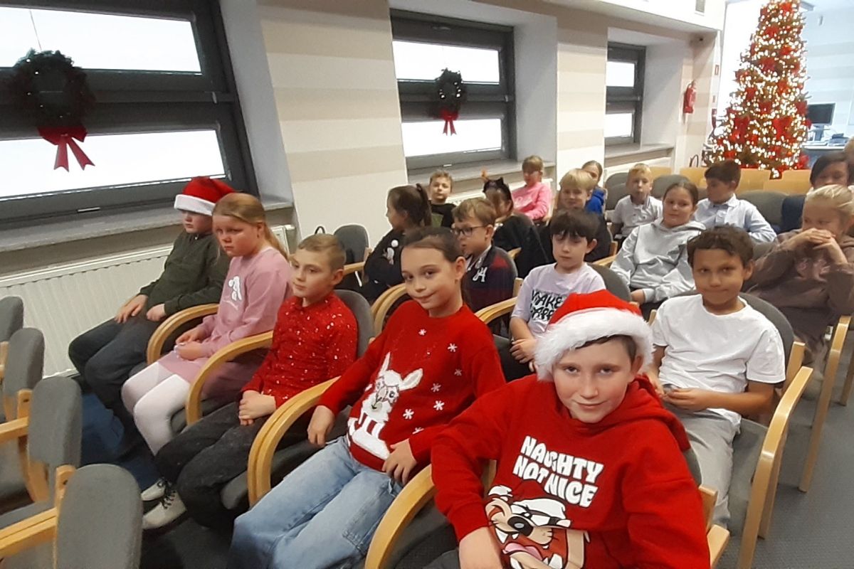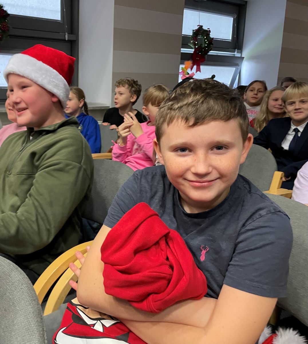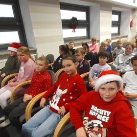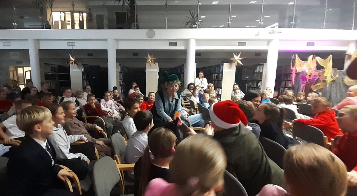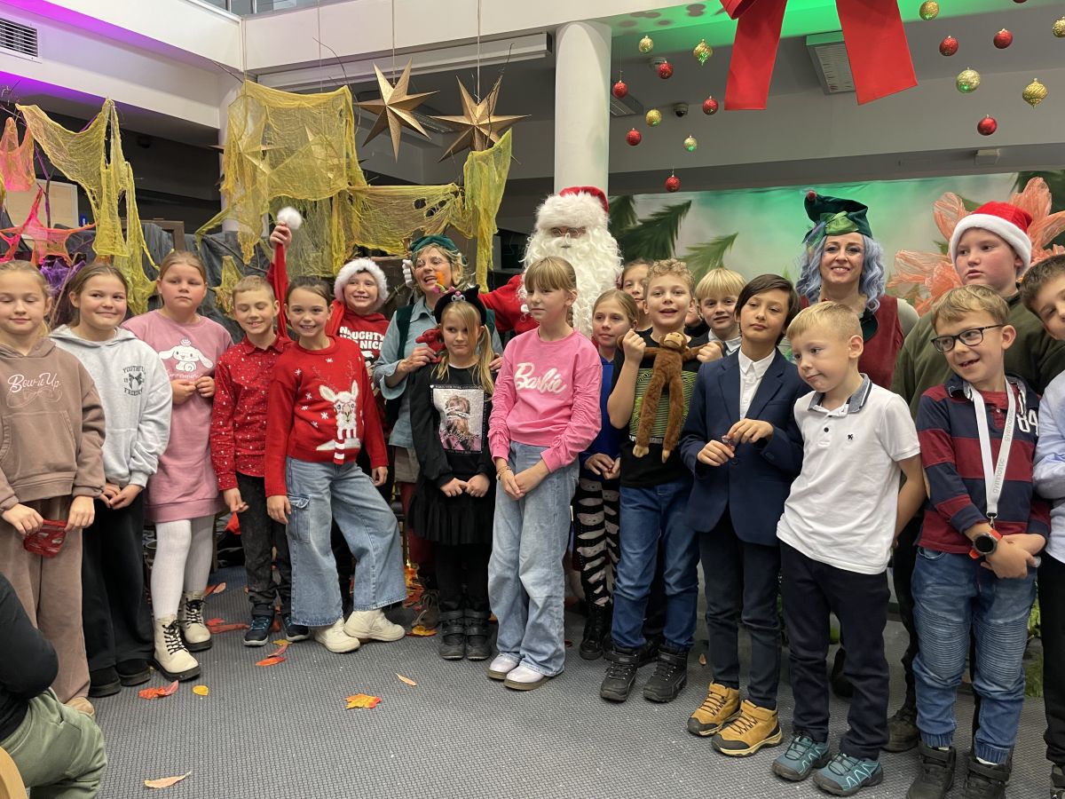 z Krakowa. Uczniowie chętnie oglądali spektakl i włączali się do zabaw animacyjnych prowadzonych przez aktorów. Na zakończenie spotkania uczniowie otrzymali od święta mikołaja słodki upominek i zapozowali do pamiątkowego zdjęcia.
