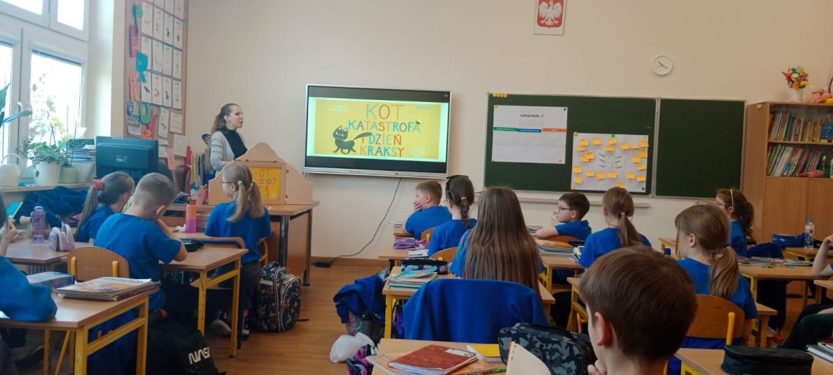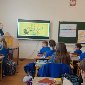 Ponadto uczniowie wysłuchali bajki teatrzyku kamishibai pt. „Kot Katastrofa i Dzień Kraksy” autorki Sabiny Furmańskiej. Uczniowie wykazali się na zajęciach dużą aktywnością i zaangażowaniem. Chętnie wykonywalni przygotowane karty pracy i odpowiadali na pytania w quzie online. Na zakończenie zajęć uczniowie odgadywali co to jest za koci bohater ? po złożeniu puzzli w formie online.