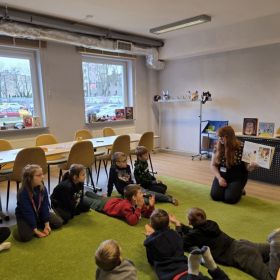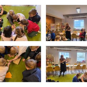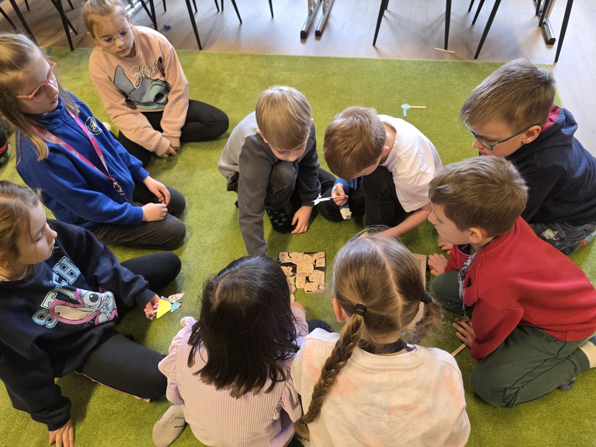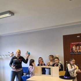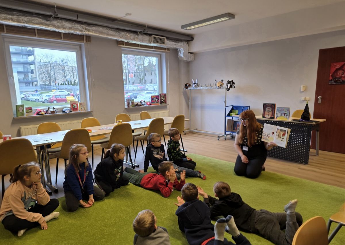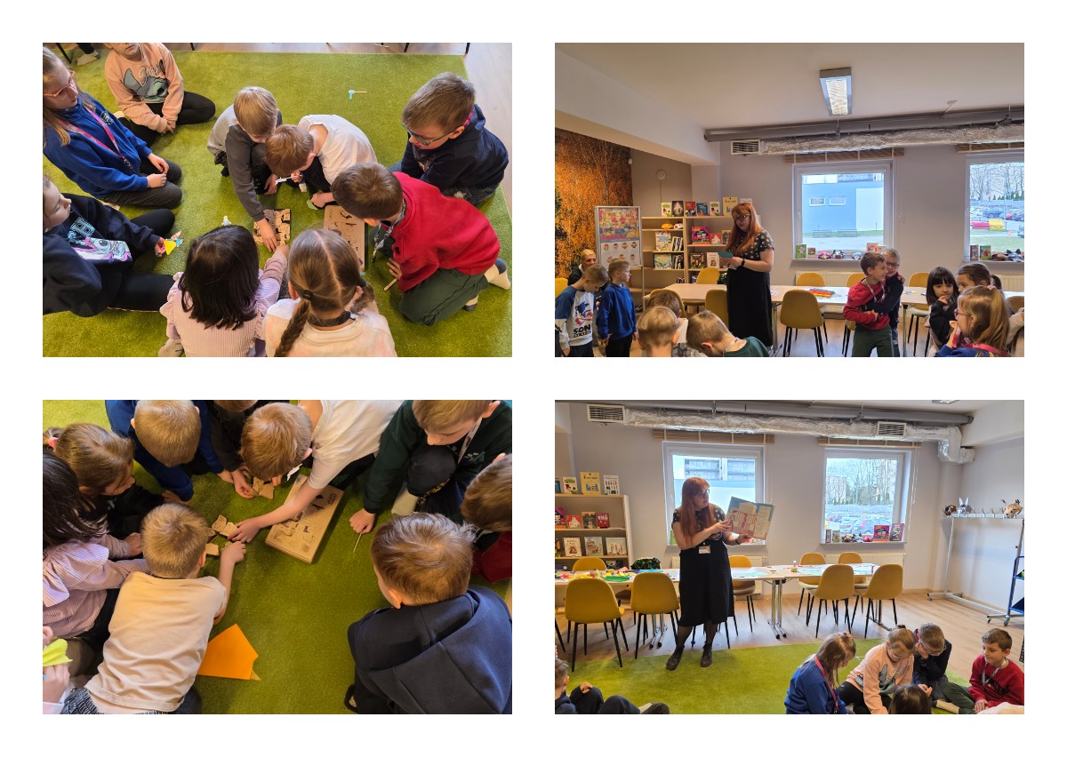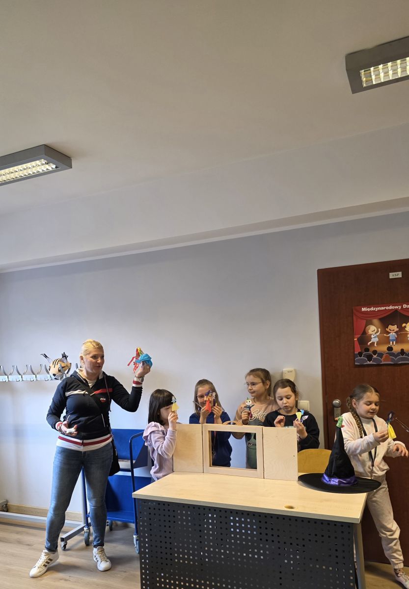 W dniu 27.03.2026 r. klasa 1b pod opieką p. R. Pastuszki. p. K. Młodawskiej i p. K. Buk udała się z wizytą do Wojewódzkiej Biblioteki Publicznej im. Witolda Gombrowicza w Kielcach. Podczas spotkania uczniowie dowiedzieli się o obchodzonym Międzynarodowym Dniu Teatru. Uczniowie wysłuchali opowiadania „Kret sam na scenie” Ulf Nilsson. Następnie wzięli udział w kalamburach i przystąpili do wykonania w grupach postaci z bajek („Kopciuszek”, „Kot w butach”, „Królewna Śnieżka”). Po przygotowaniu postaci uczniowie mieli okazję do ich zaprezentowania za pomocą teatrzyku kamishibai. Na zakończenie spotkania uczniowie układali puzzle nawiązujące do teatru.