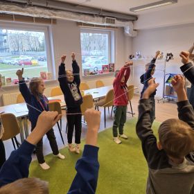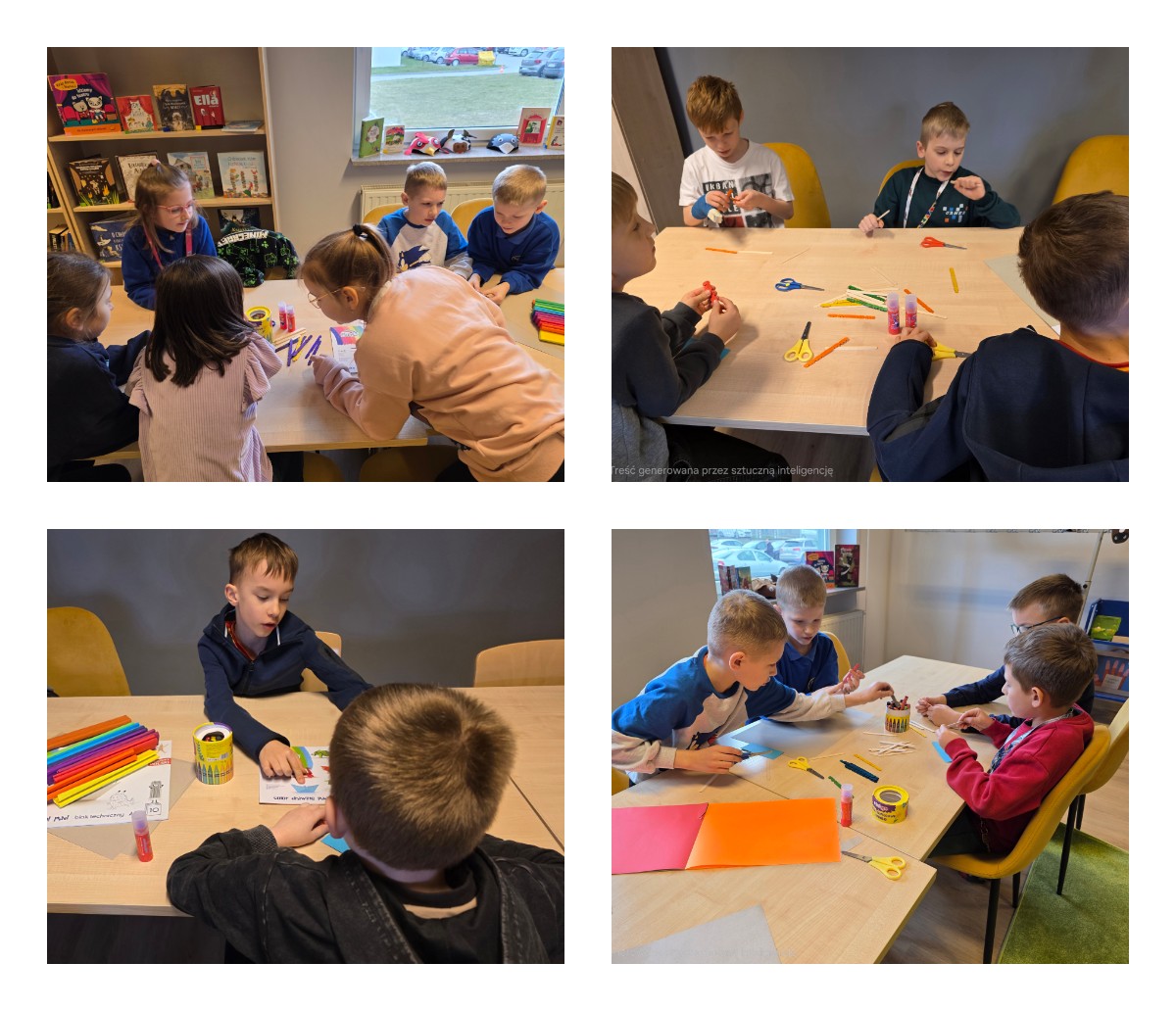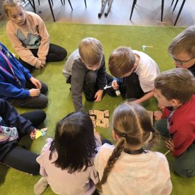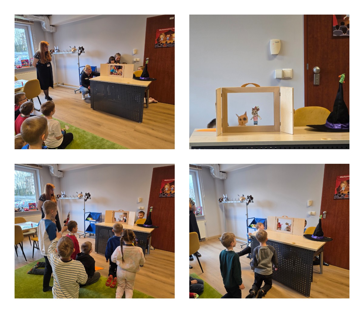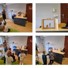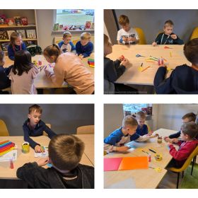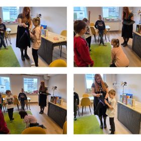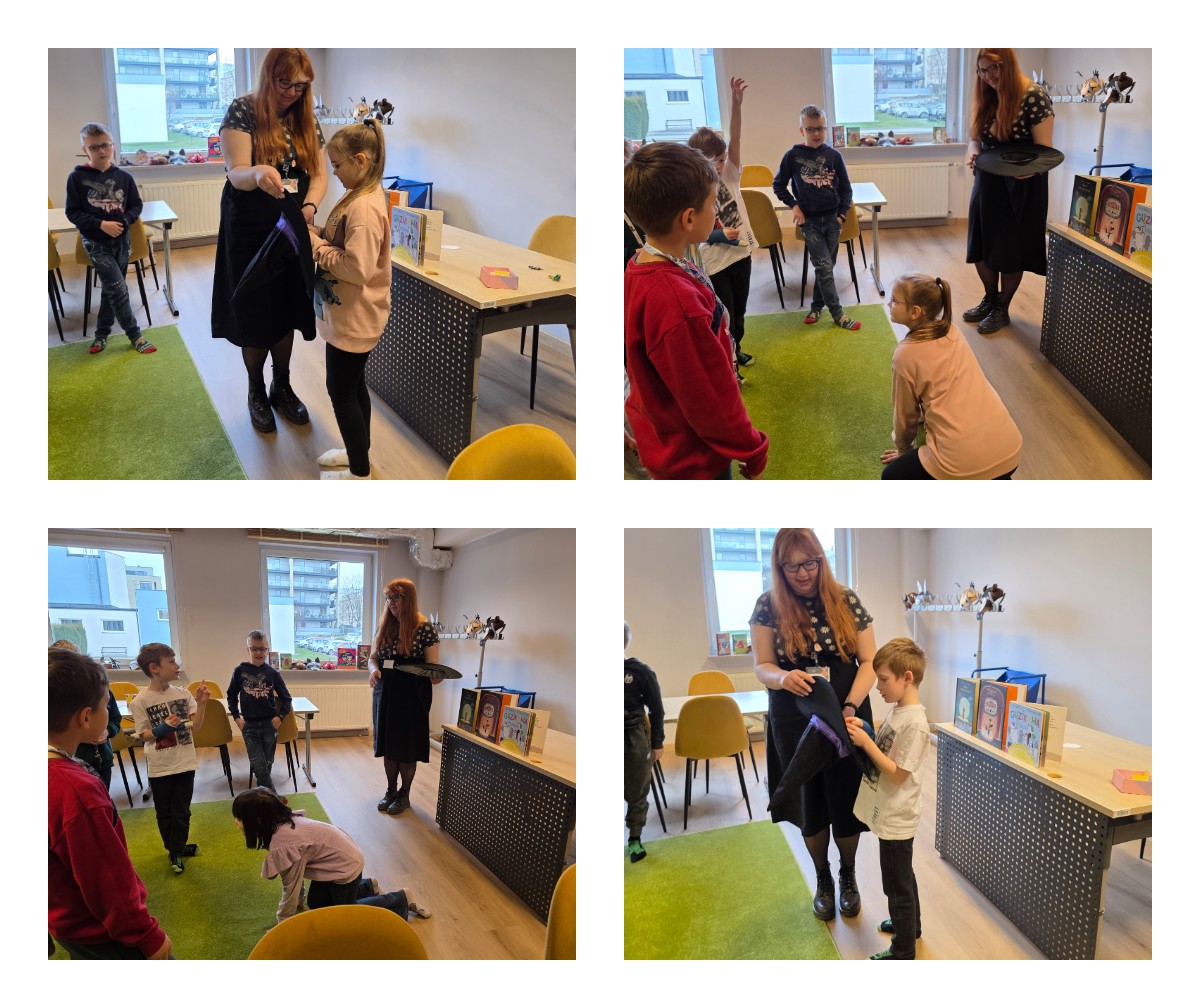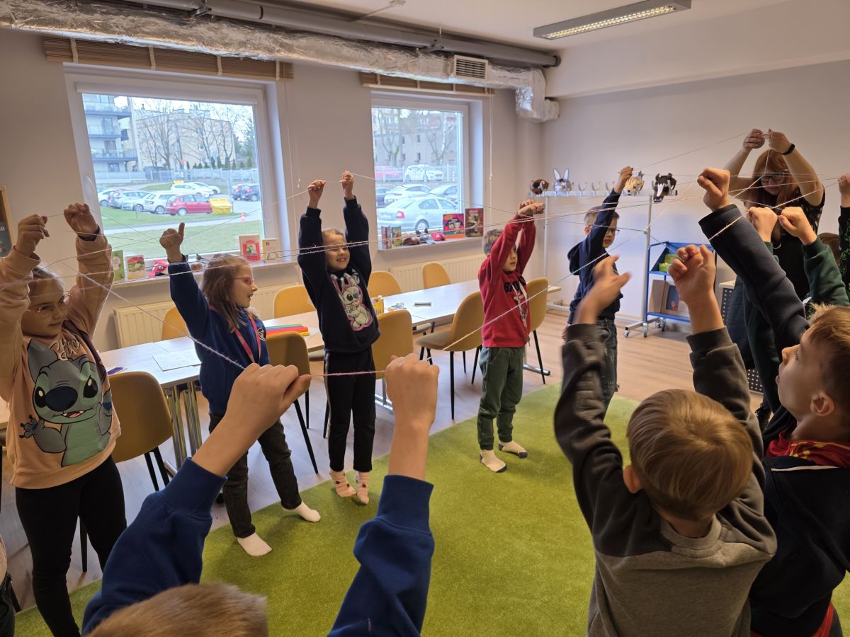 W dniu 27.03.2026 r. klasa 1b pod opieką p. R. Pastuszki. p. K. Młodawskiej i p. K. Buk udała się z wizytą do Wojewódzkiej Biblioteki Publicznej im. Witolda Gombrowicza w Kielcach. Podczas spotkania uczniowie dowiedzieli się o obchodzonym Międzynarodowym Dniu Teatru. Uczniowie wysłuchali opowiadania „Kret sam na scenie” Ulf Nilsson. Następnie wzięli udział w kalamburach i przystąpili do wykonania w grupach postaci z bajek („Kopciuszek”, „Kot w butach”, „Królewna Śnieżka”). Po przygotowaniu postaci uczniowie mieli okazję do ich zaprezentowania za pomocą teatrzyku kamishibai. Na zakończenie spotkania uczniowie układali puzzle nawiązujące do teatru.