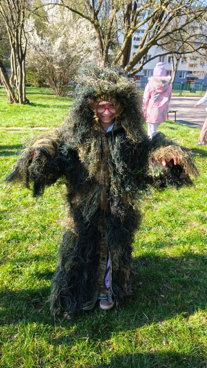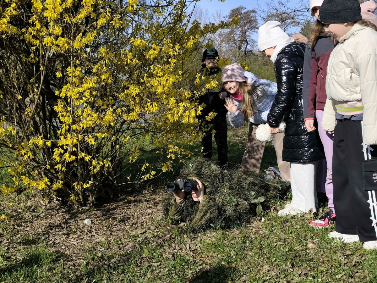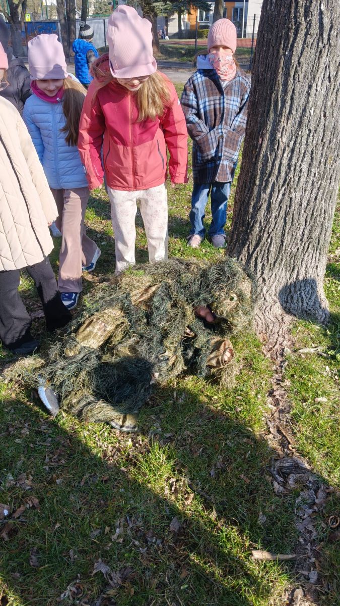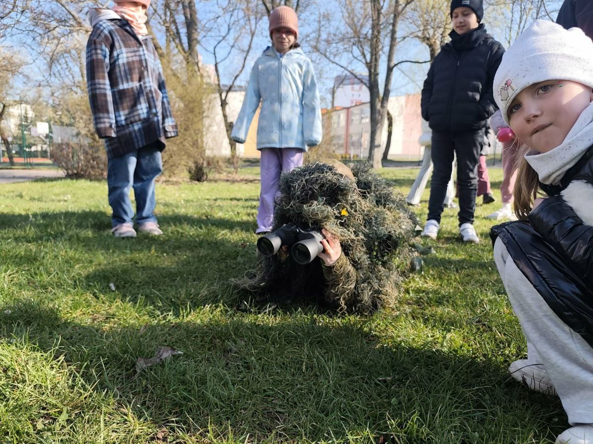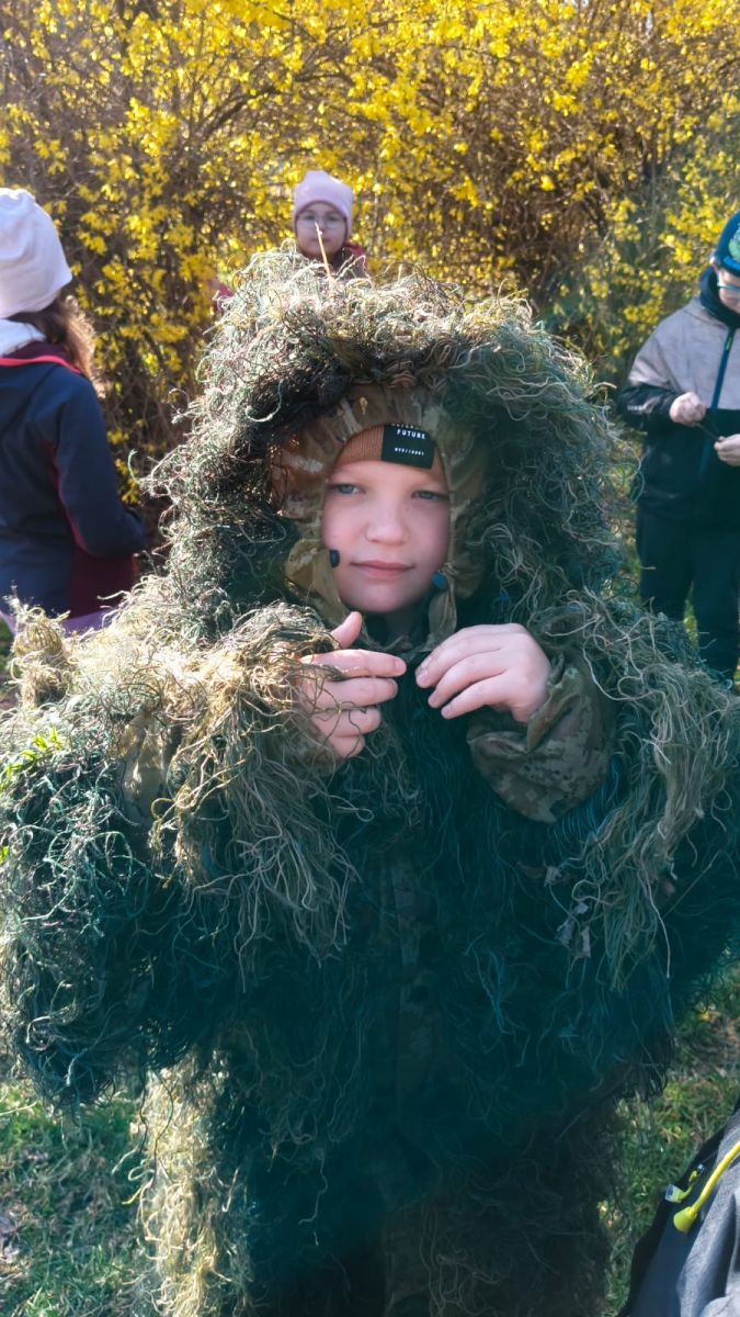 Klasa 2a zamieniła dziś szkolne ławki na lekcje w terenie. Podczas zajęć nasi uczniowie mieli okazję poczuć się jak prawdziwi ornitolodzy – dosłownie i w przenośni, za sprawą specjalnego kamuflażu , który pozwalał im pozostać niezauważonymi przez ptaki i poczuć się jak prawdziwi badacze .