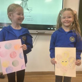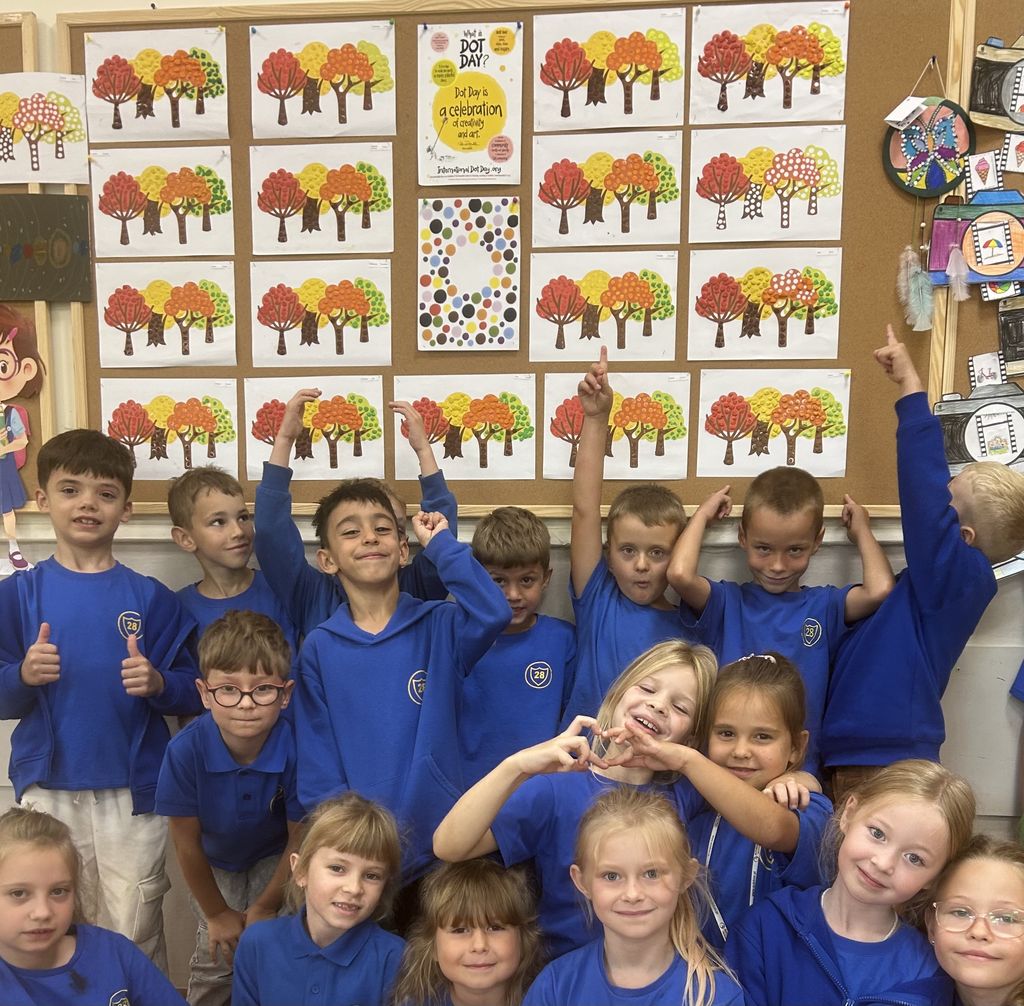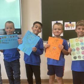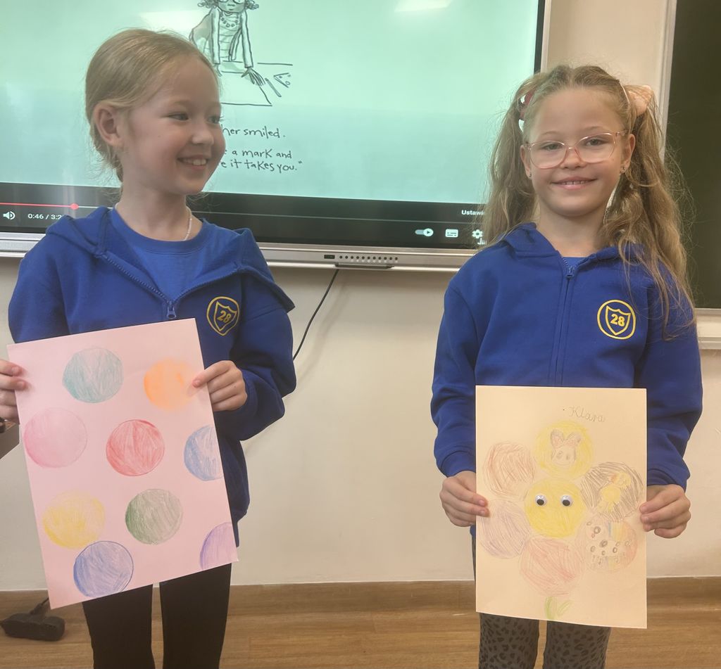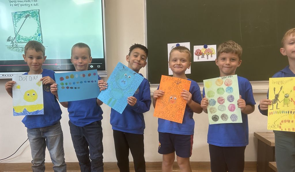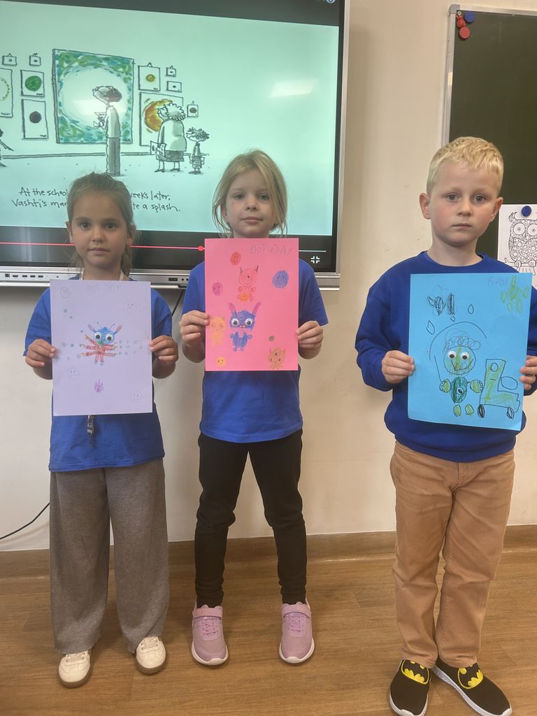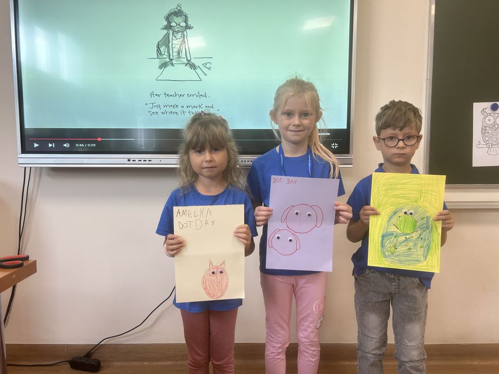 W ramach innowacji pedagogicznej My English Class uczniowie klasy 1C z okazji Międzynarodowego Dnia Kropki mieli okazję wysłuchać anglojęzycznej historii „The Dot" o dziewczynce imieniem Vashti 🎨. Historia pokazała, że każdy z nas może odkryć w sobie kreatywność i odwagę, nawet jeśli na początku nie wierzy w swoje możliwości. Zainspirowani Vashti, uczniowie stworzyli własne, kolorowe prace typu dot art, łącząc naukę języka angielskiego z twórczą zabawą 🌟.
