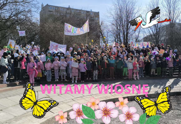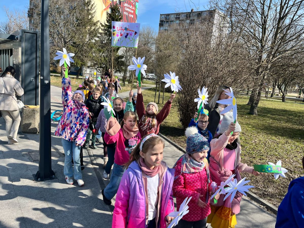21 marca wszystkie młodsze oddziały 0-3 wraz z nauczycielami wybrały się na wiosenny spacer ulicami osiedla. Każda klasa przygotowała na ten cel wiosenne dekoracje. Uwagę przechodniów przykuwały piękne wiosenne kwiaty, transparenty z wiosennymi malowidłami oraz hasłami a kolorem, który królował był oczywiście zielony! Wszystkie oddziały zjednoczyły swoje siły i wspólnie śpiewały piosenkę „Maszeruje wiosna”. Pogoda dopisywała… Na twarzach dzieci jak i dorosłych malowały się wiosenne uśmiechy. Ten korowód nie tylko powitał nową porę roku ale i przyniósł mnóstwo słońca nastrojach wszystkich zaangażowanych w to przedsięwzięcie osób.
