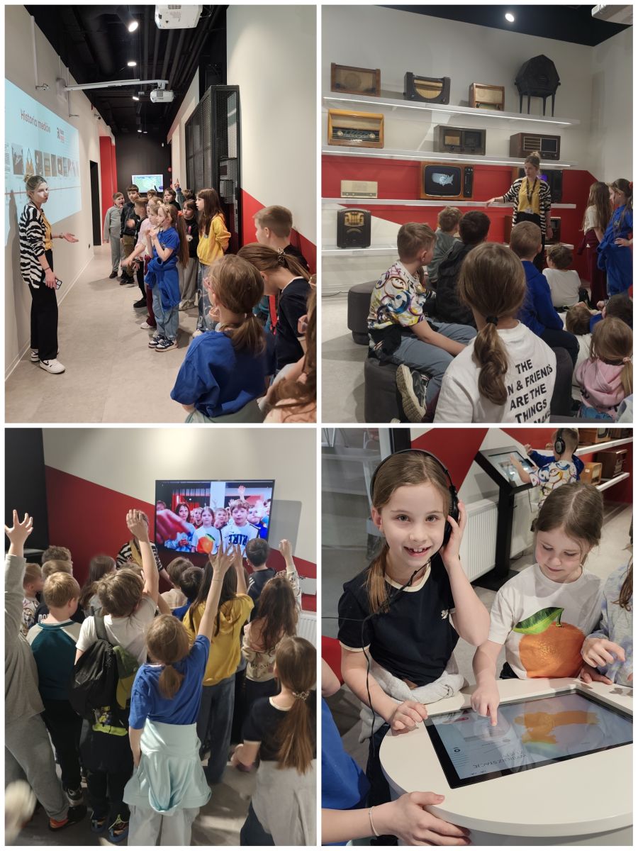 Wizyta rozpoczęła się od poznania historii mediów. Uczniowie zobaczyli jak wyglądały pierwsze radia i urządzenia, do analogowego montażu dźwięku. W gablotach wyeksponowane były stare odbiorniki radiowe. Niektóre z nich nasze dzieci widziały pierwszy raz.