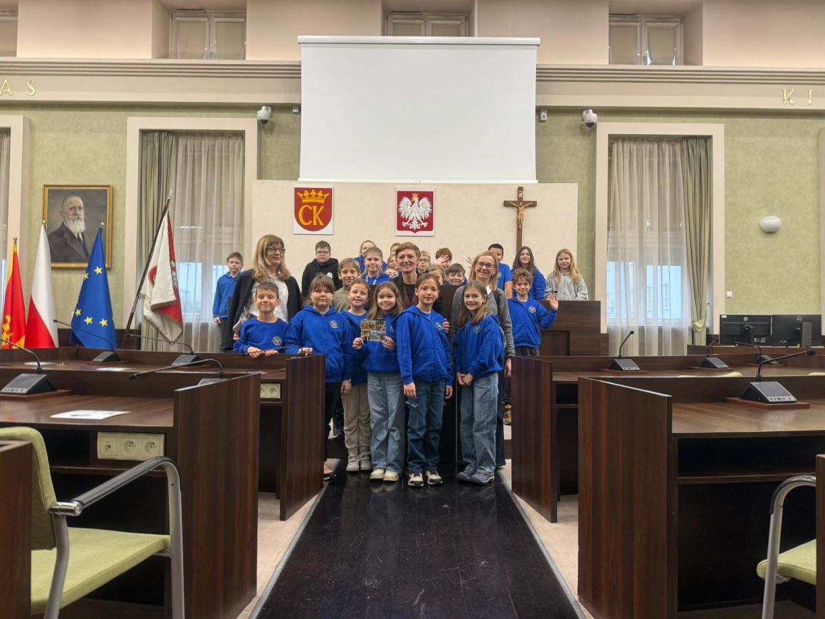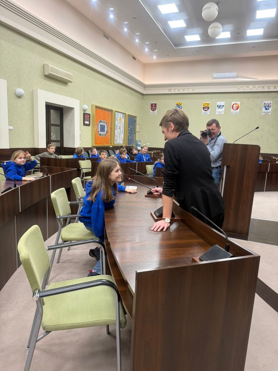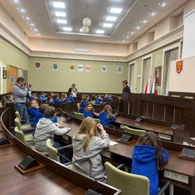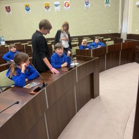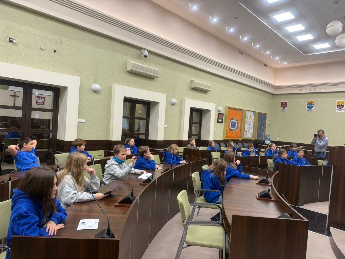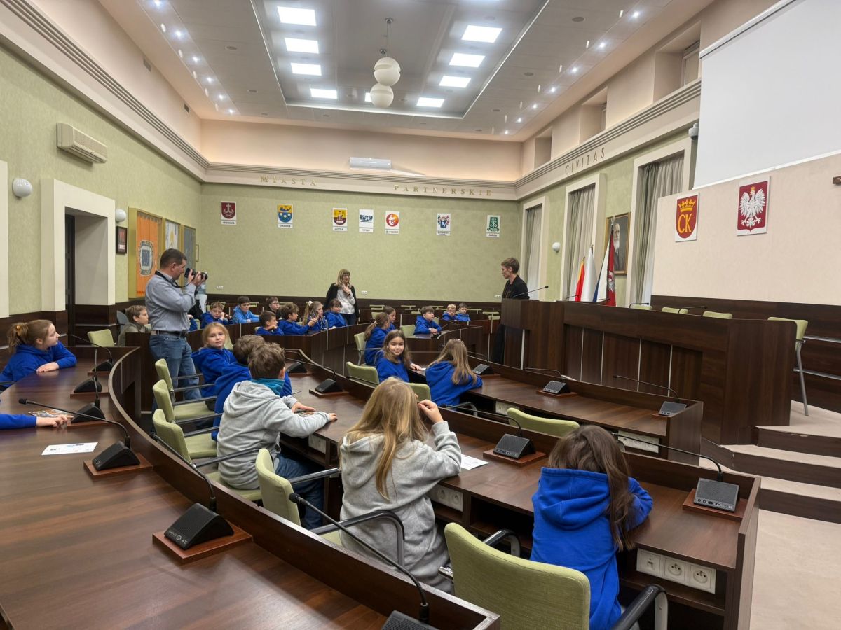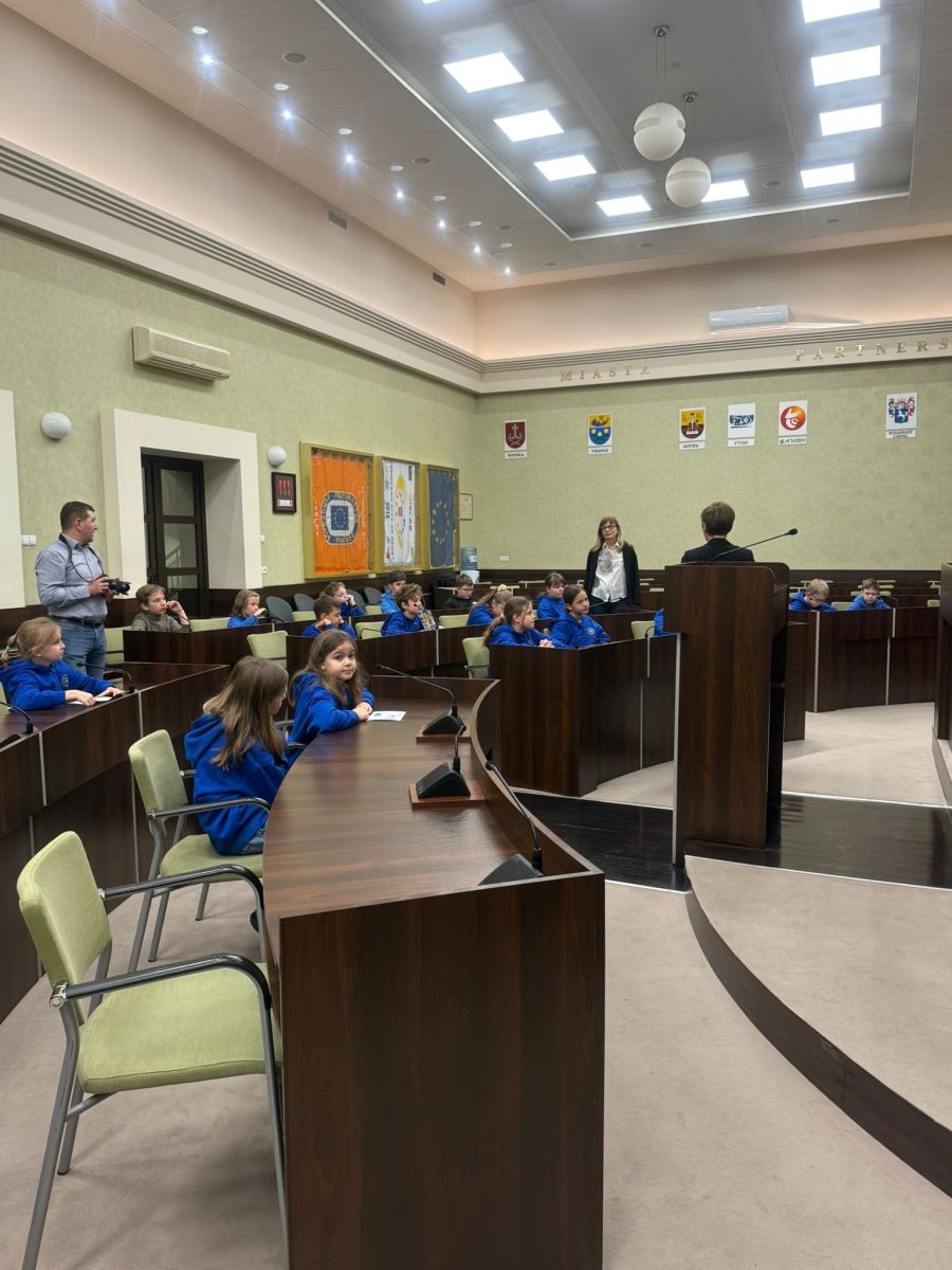 Trzecioklasiści w gabinecie pani prezydentki mieli wyjątkową okazję zasiąść w fotelu Agaty Wojdy i przybić pieczątkę na otrzymanej widokówce. Następnie dzieci zasiadły w ławach miejskich radnych w sali konferencyjnej, by poczuć atmosferę towarzyszącą obradom Rady Miasta. Zadawali wiele ciekawych pytań, które dotyczyły między innymi minimalnego wieku, od którego można ubiegać się o urząd prezydenta miasta, oraz sposobu gospodarowania środkami budżetowymi przez samorząd.