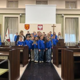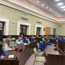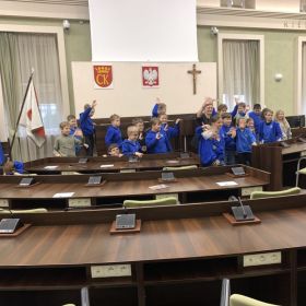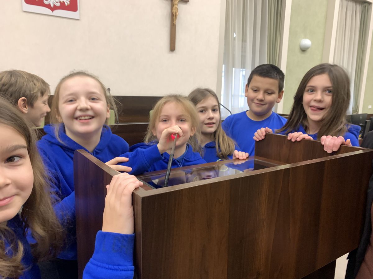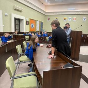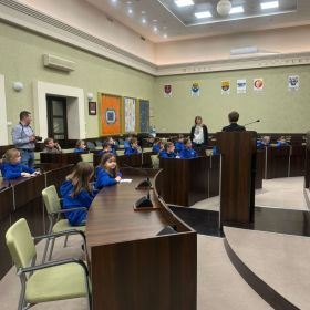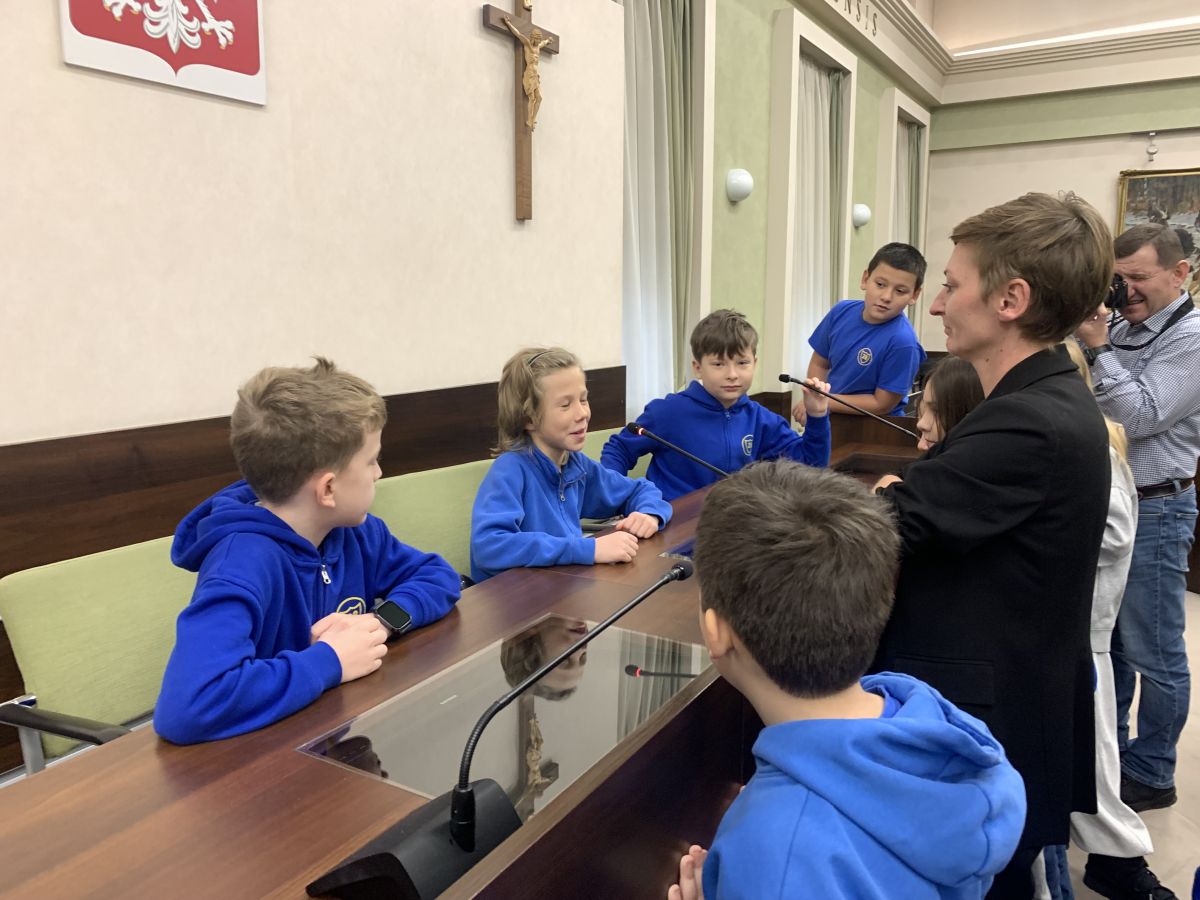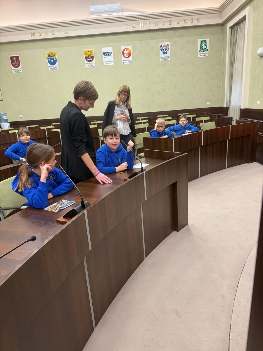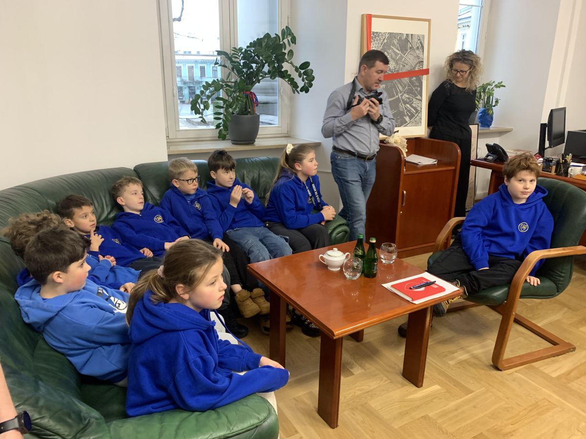 Trzecioklasiści w gabinecie pani prezydentki mieli wyjątkową okazję zasiąść w fotelu Agaty Wojdy i przybić pieczątkę na otrzymanej widokówce. Następnie dzieci zasiadły w ławach miejskich radnych w sali konferencyjnej, by poczuć atmosferę towarzyszącą obradom Rady Miasta. Zadawali wiele ciekawych pytań, które dotyczyły między innymi minimalnego wieku, od którego można ubiegać się o urząd prezydenta miasta, oraz sposobu gospodarowania środkami budżetowymi przez samorząd.