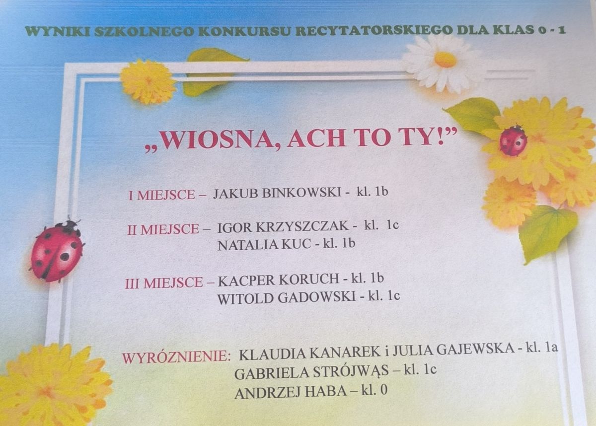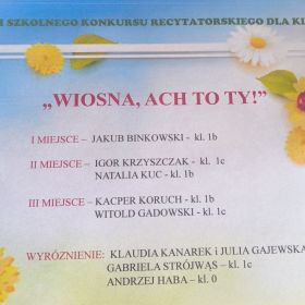 19 marca 2026 r. w ramach Tygodnia Kultury Języka odbył się konkurs recytatorski o tematyce wiosennej. Najmłodsi uczniowie z naszej szkoły zaprezentowali się na małej scenie. Klimat był naprawdę wiosenny. Gratulujemy wszystkim uczestnikom, a szczególnie Laureatom.