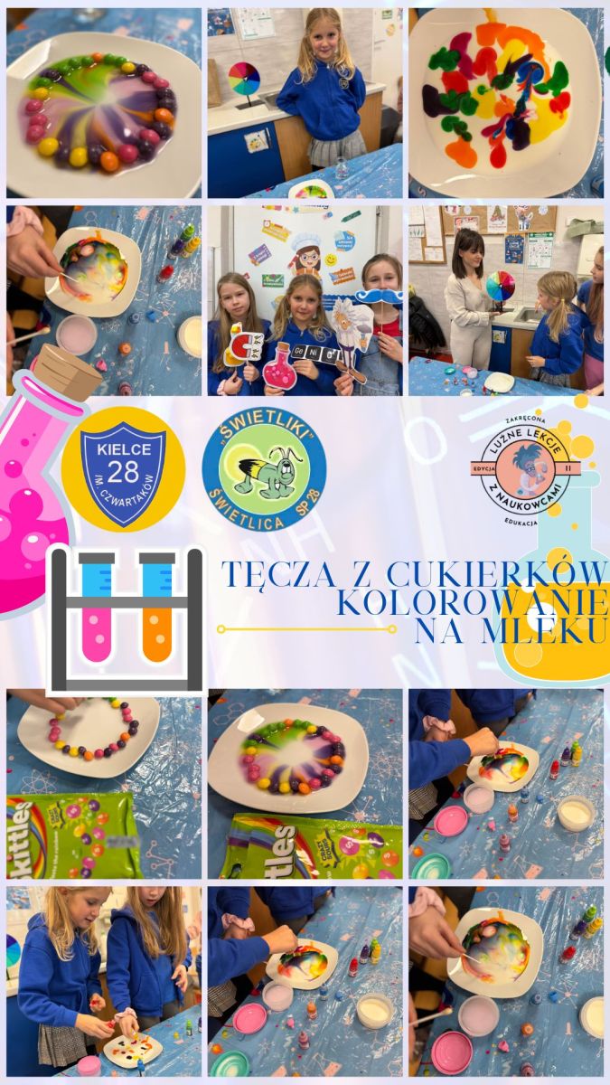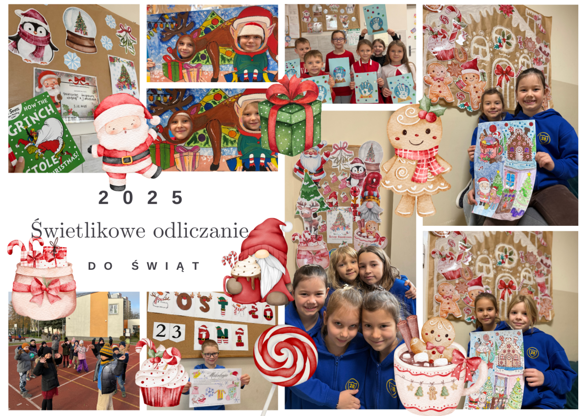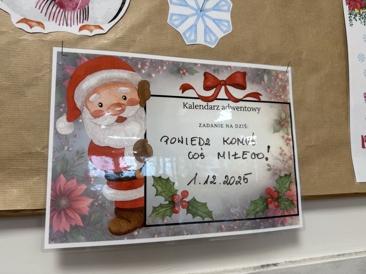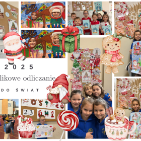 Odliczanie do świąt umila nam kalendarz adwentowy przygotowany przez panią Patrycję Jasińską, która codziennie zaskakuje nas nowym zadaniem. Mówiliśmy sobie miłe słowa, czytaliśmy z panem Michałem Grincha, pisaliśmy listy do Mikołaja, kolorowaliśmy duże świąteczne obrazki i wspólnie dekorowaliśmy szkołę. Nie zabrakło też zabaw mikołajkowych, ruchu na świeżym powietrzu oraz eksperymentów — malowania na mleku i tęczy z cukierków.