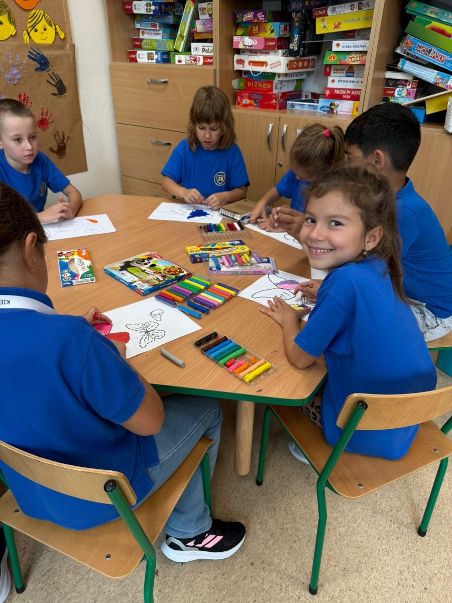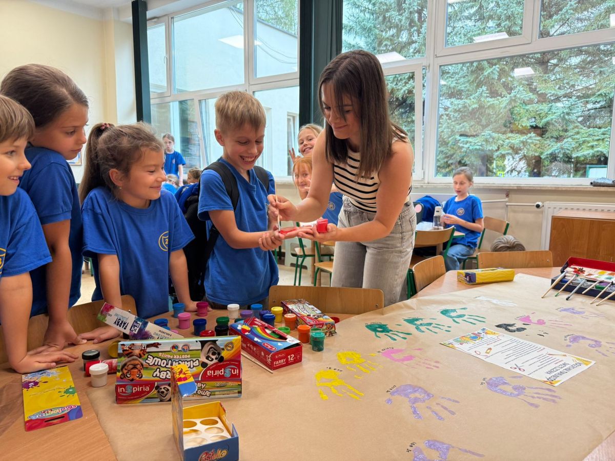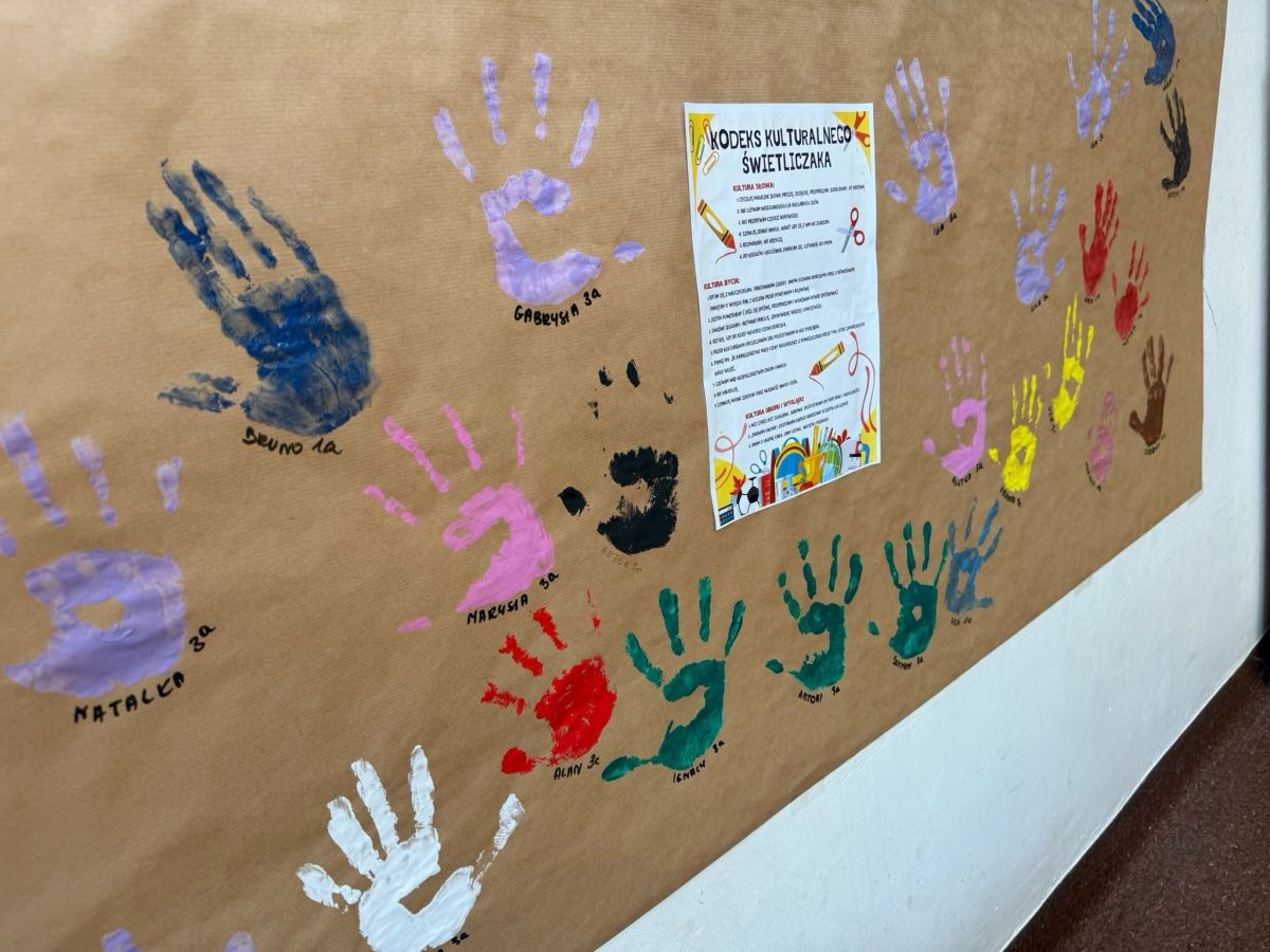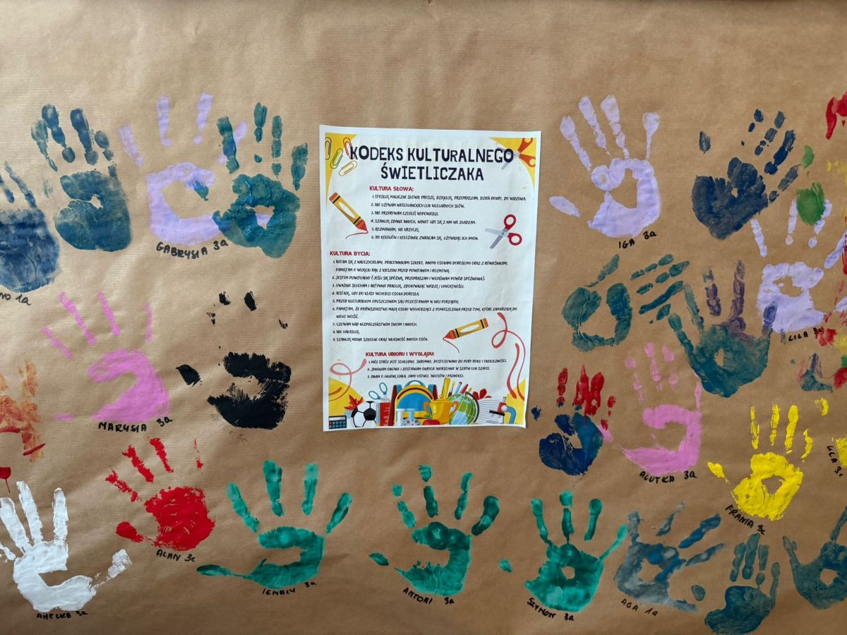 Na zdjęciach uchwyciliśmy wyjątkowe chwile ze świetlicy klas 1–3. Uczniowie wspólnie podpisują Kodeks Kulturalnego Świetliczaka, zostawiając pod nim kolorowe odciski swoich dłoni – symbol zgody na przestrzeganie wspólnie ustalonych zasad. Widzimy również efekty naszej pracy: tworzenie wspólnej, kolorowej pracy plastycznej oraz porządkowanie kącika z grami i puzzlami. To był czas pełen zaangażowania, współpracy i radości z działania w grupie!