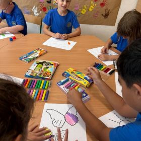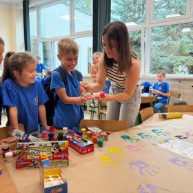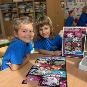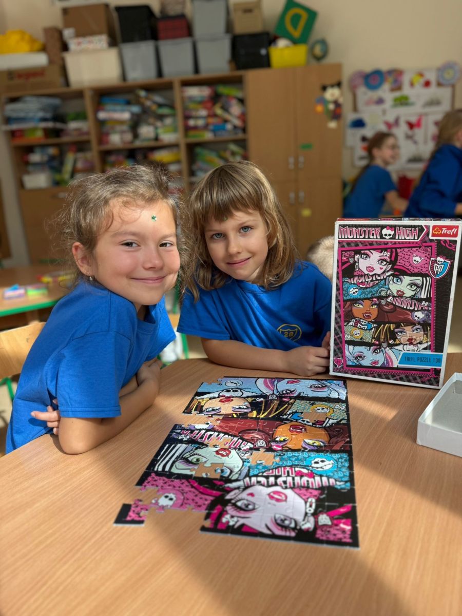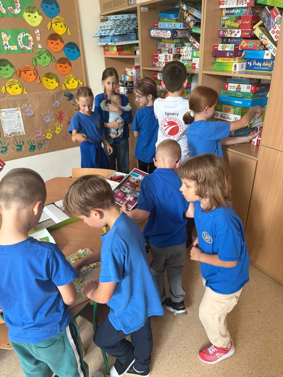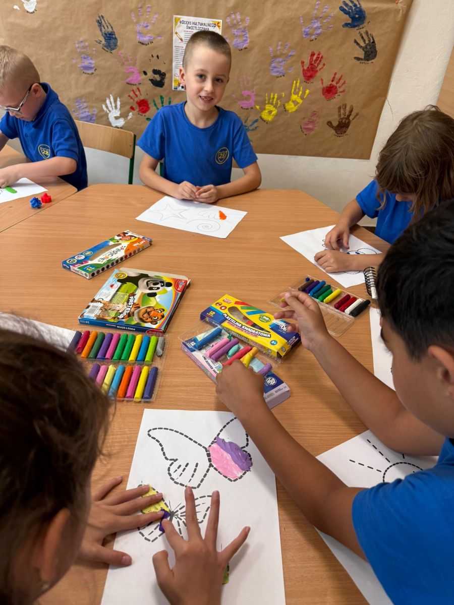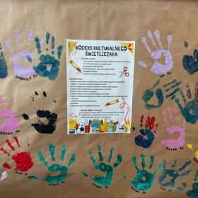Na zdjęciach uchwyciliśmy wyjątkowe chwile ze świetlicy klas 1–3. Uczniowie wspólnie podpisują Kodeks Kulturalnego Świetliczaka, zostawiając pod nim kolorowe odciski swoich dłoni – symbol zgody na przestrzeganie wspólnie ustalonych zasad. Widzimy również efekty naszej pracy: tworzenie wspólnej, kolorowej pracy plastycznej oraz porządkowanie kącika z grami i puzzlami. To był czas pełen zaangażowania, współpracy i radości z działania w grupie!